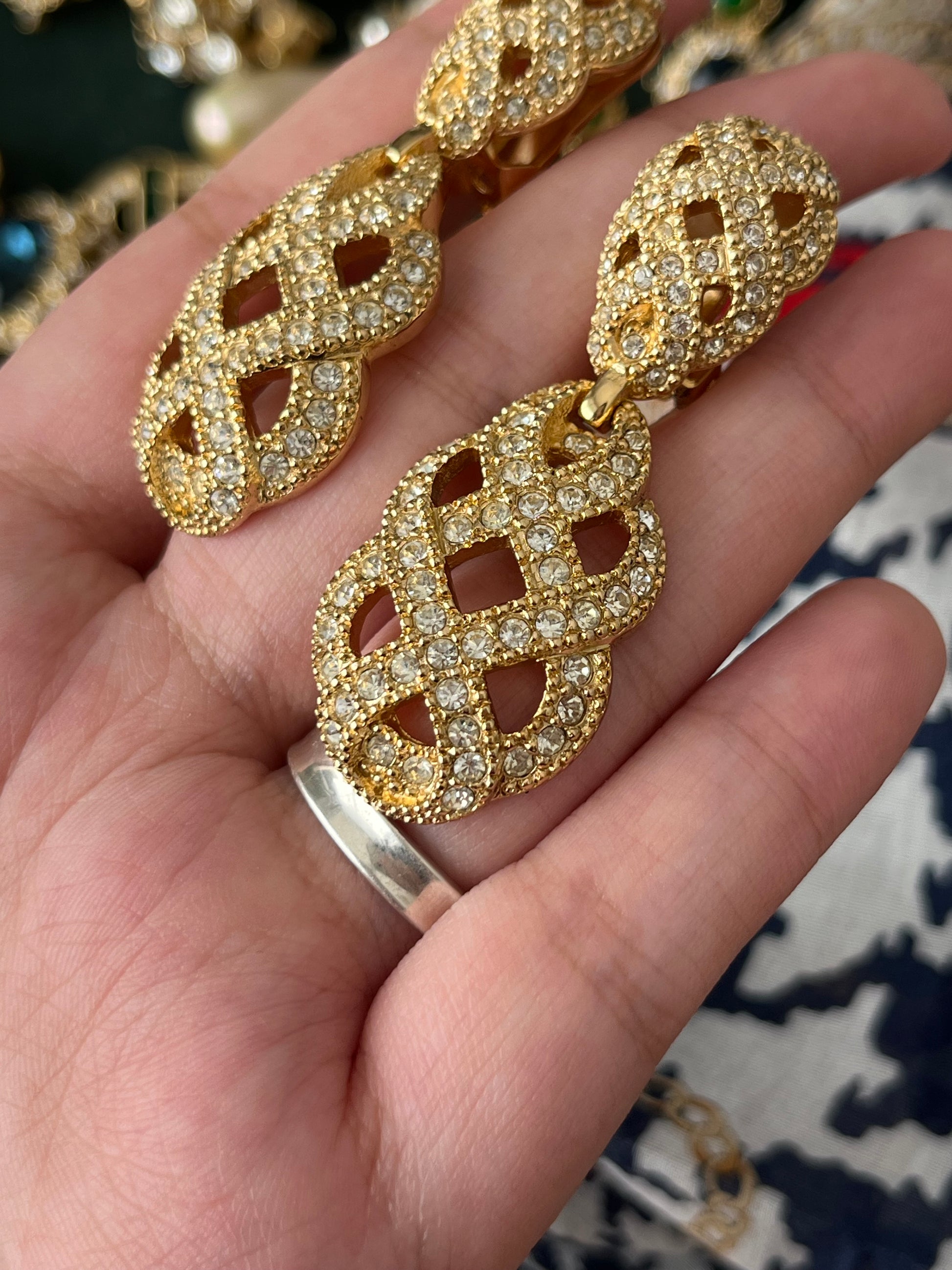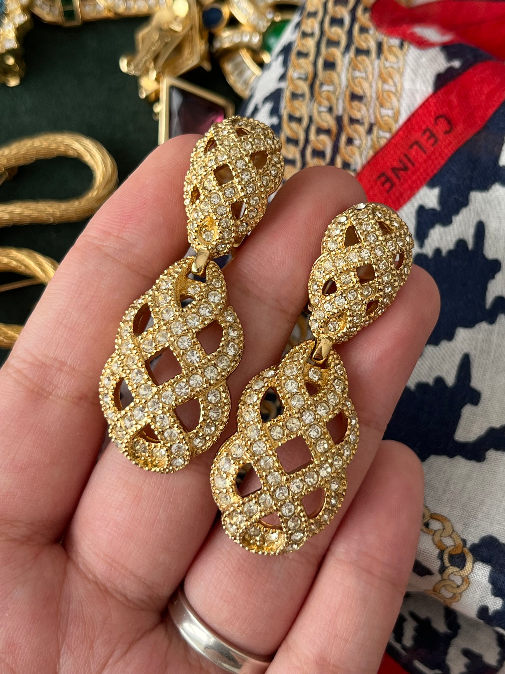 Vintage Christian Dior "Lace" Collection Hollow Braided Teardrop Dangle Drop Rhinestone Gold-Tone Clip-On Earrings