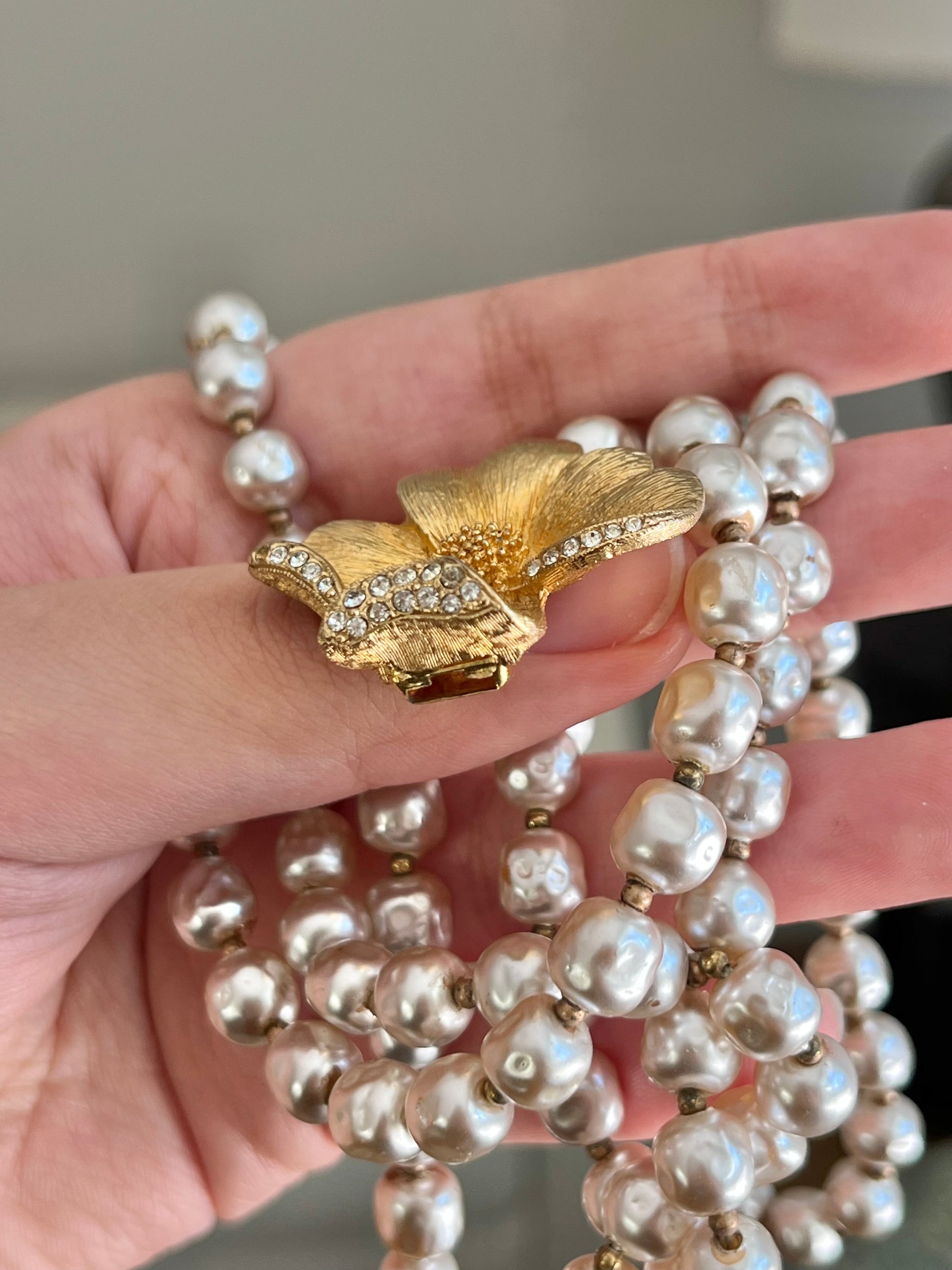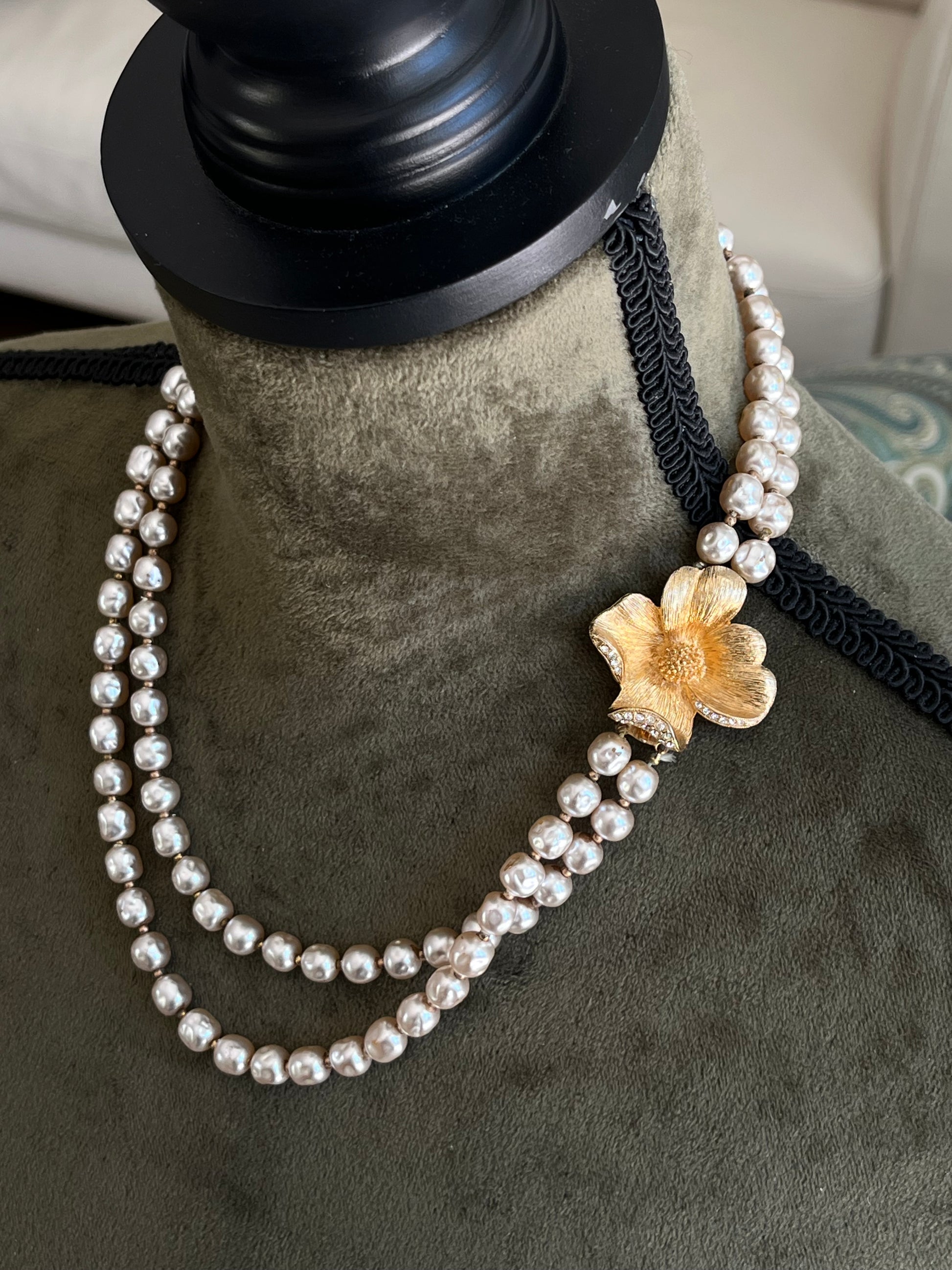 Vintage Unsigned Miriam Haskell Style Baroque Glass Pearl Double-Stranded Layered Rhinestone Brushed Gold-Tone Flower Clasp Necklace