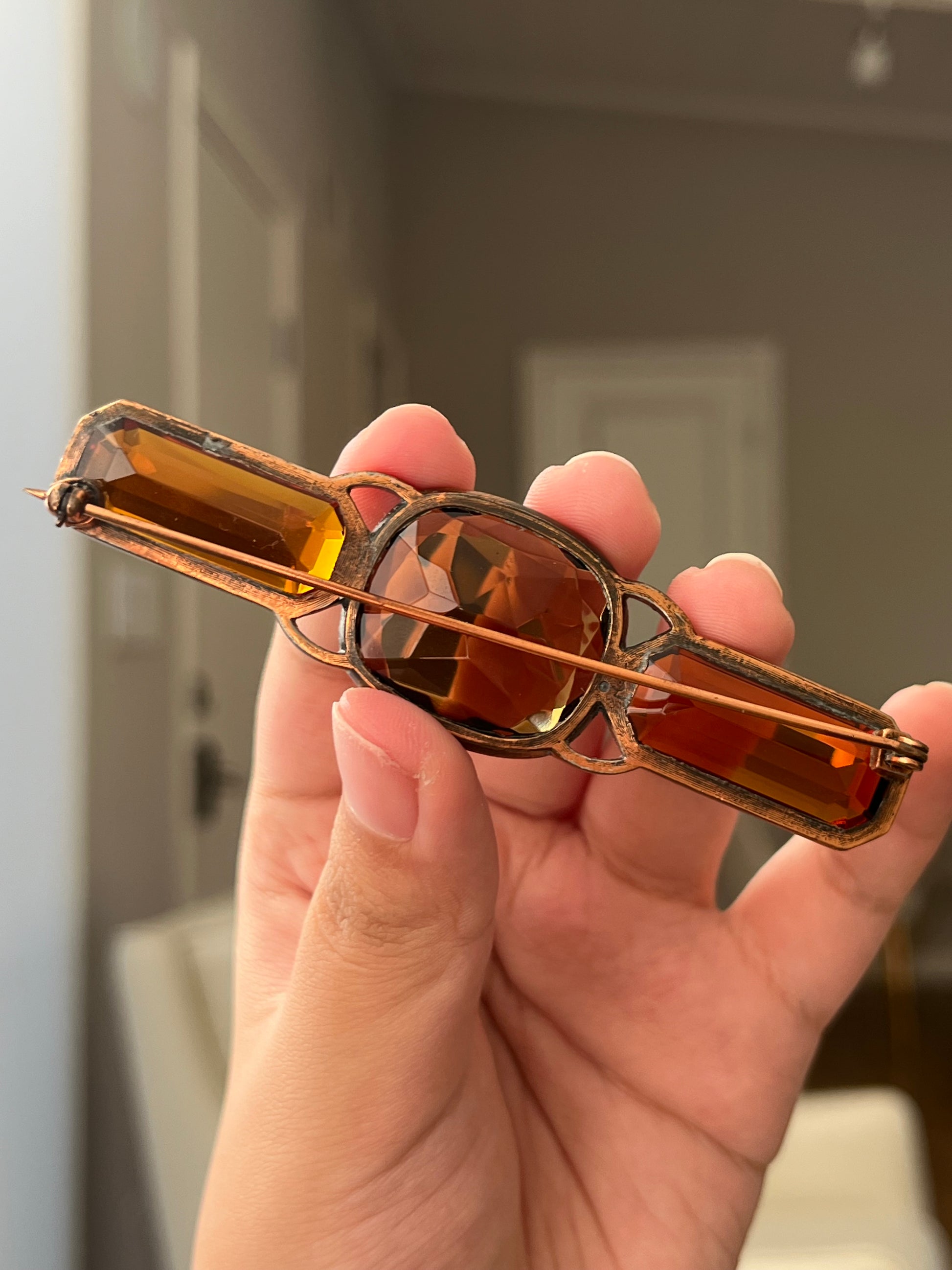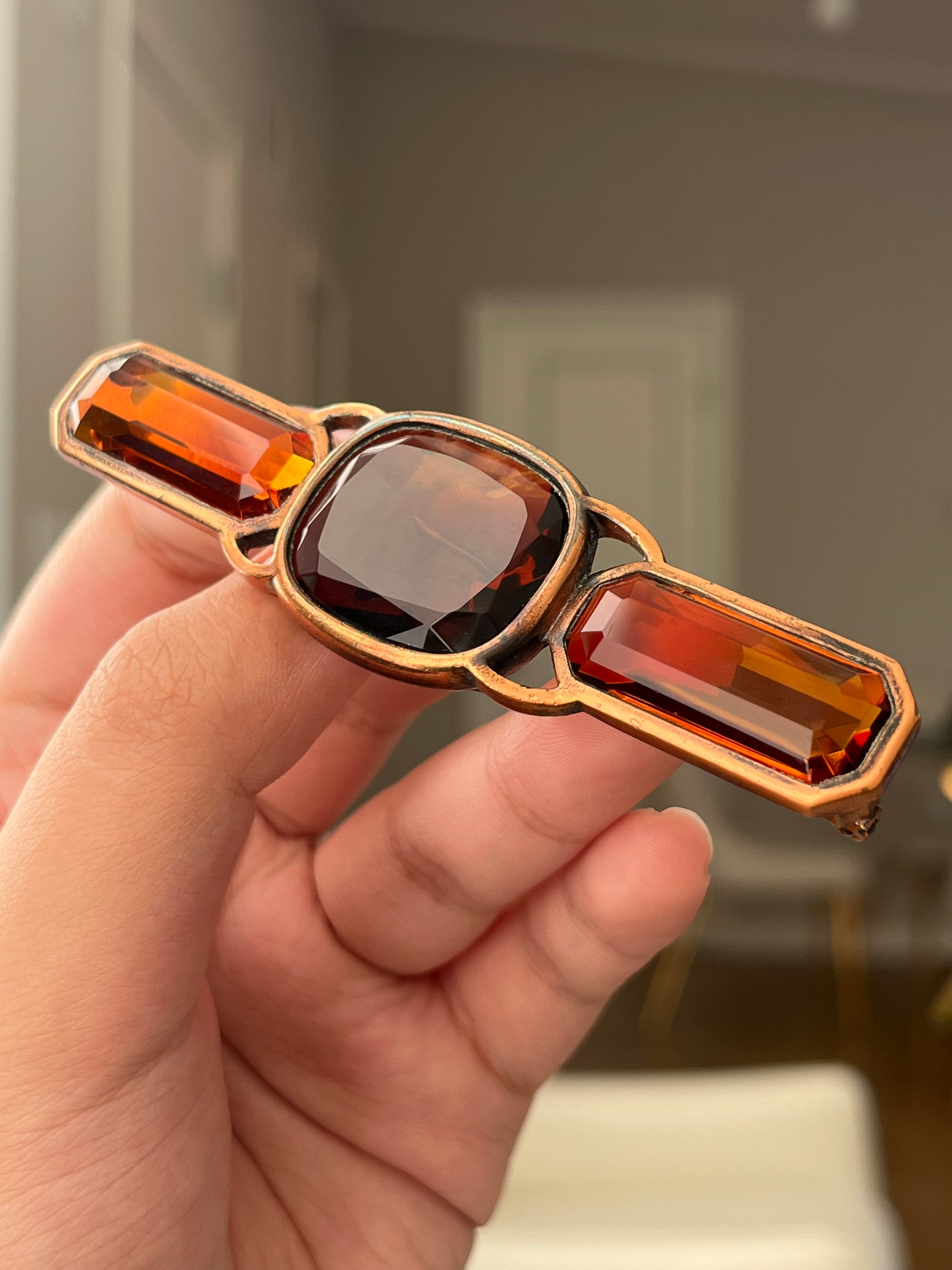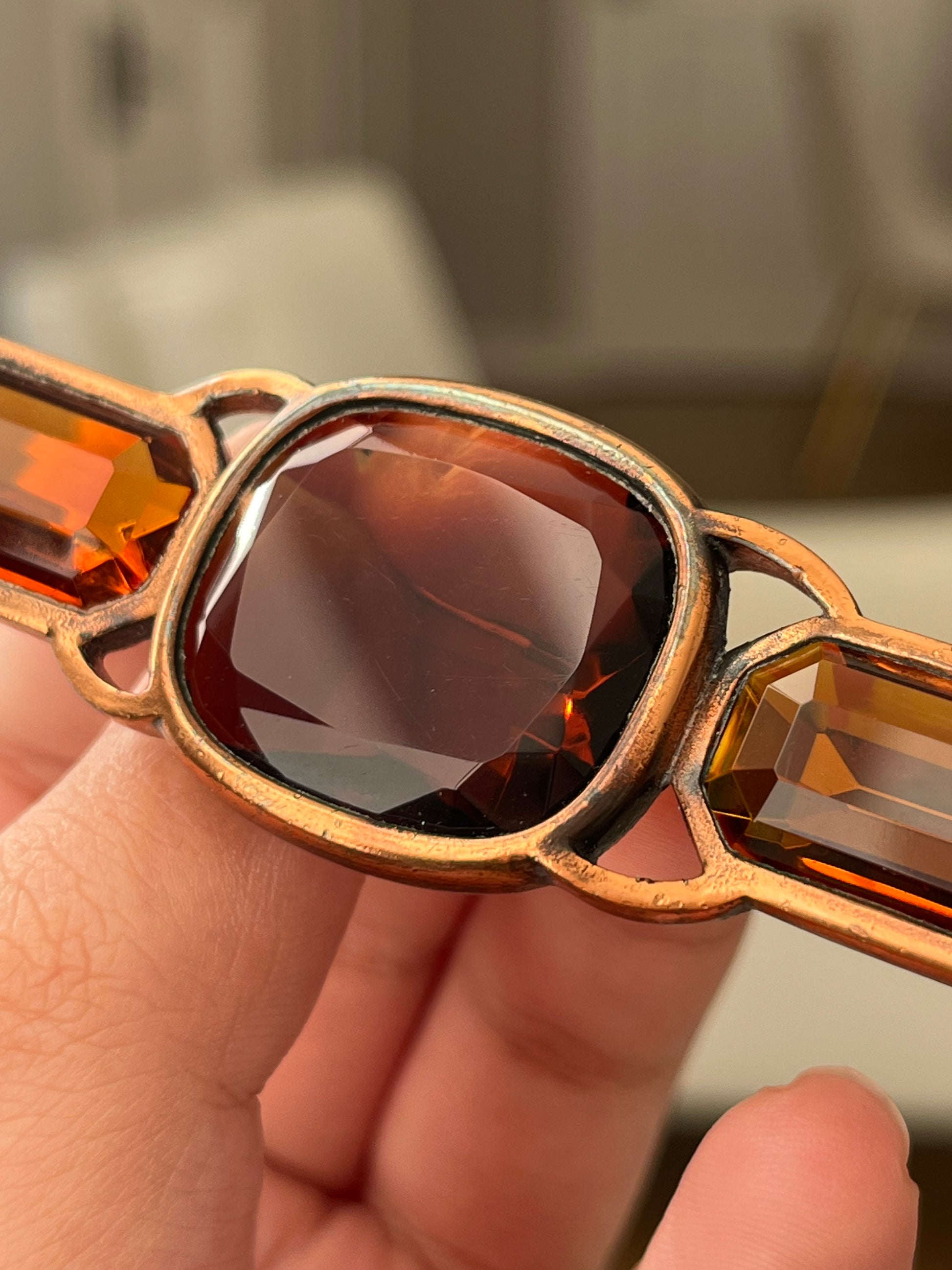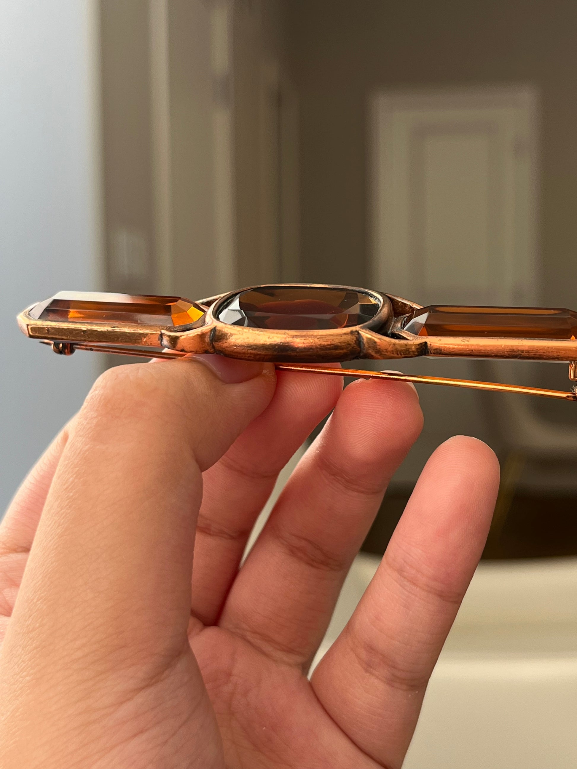 Vintage Yves Saint Laurent YSL Large Open Back Brown Rhinestone Rose Gold-Tone Bar Brooch
