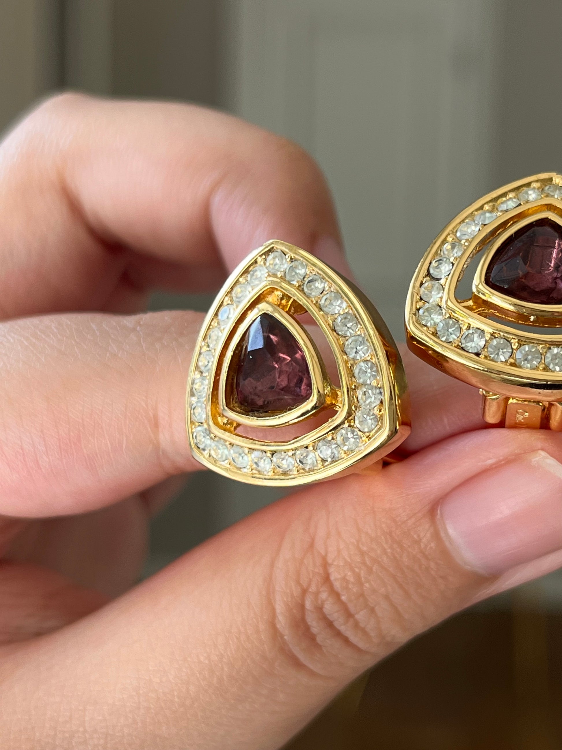 Vintage Christian Dior Triangular Purple Rhinestone Hollow Edge Gold-Tone Clip-On Earrings