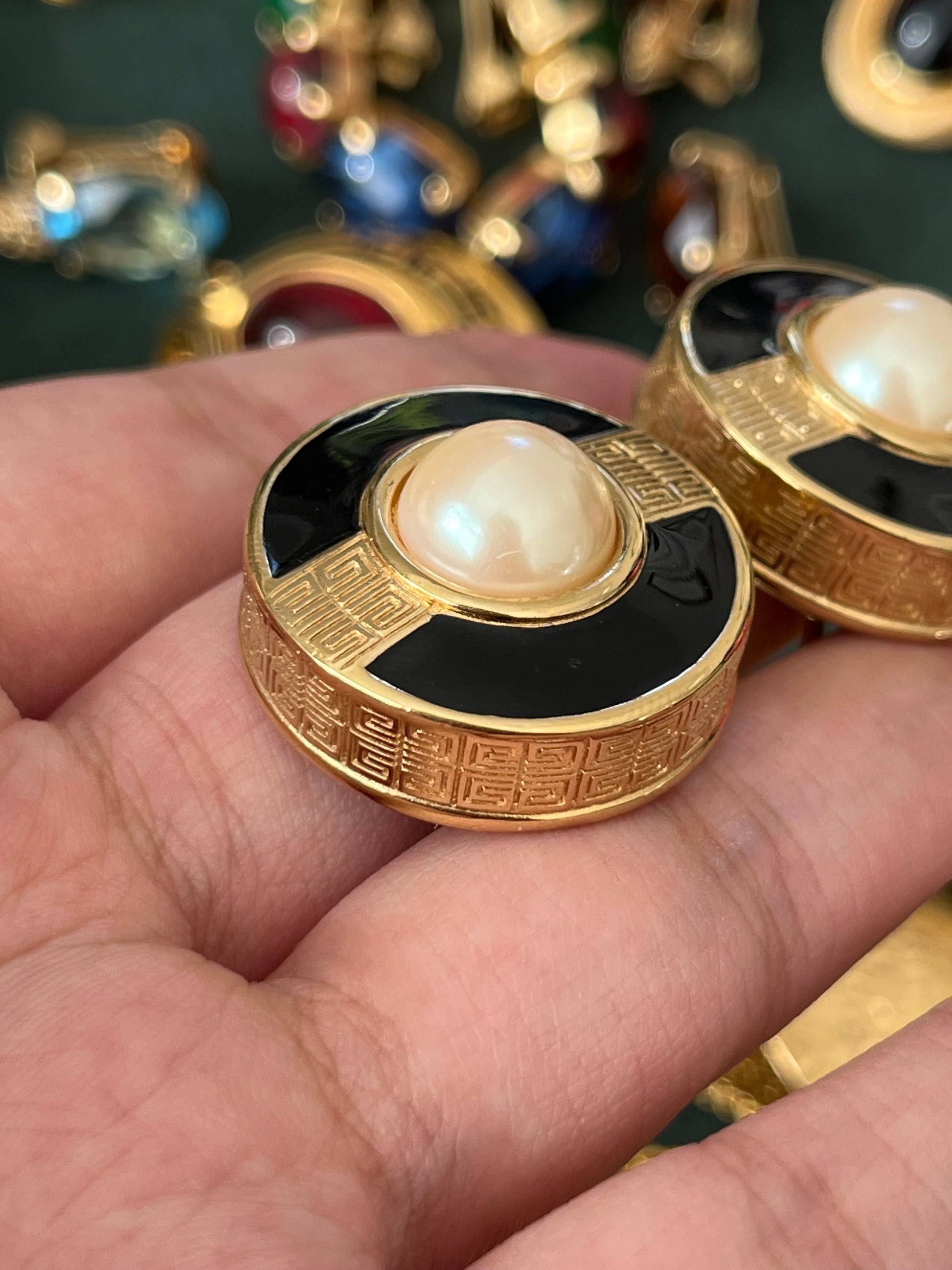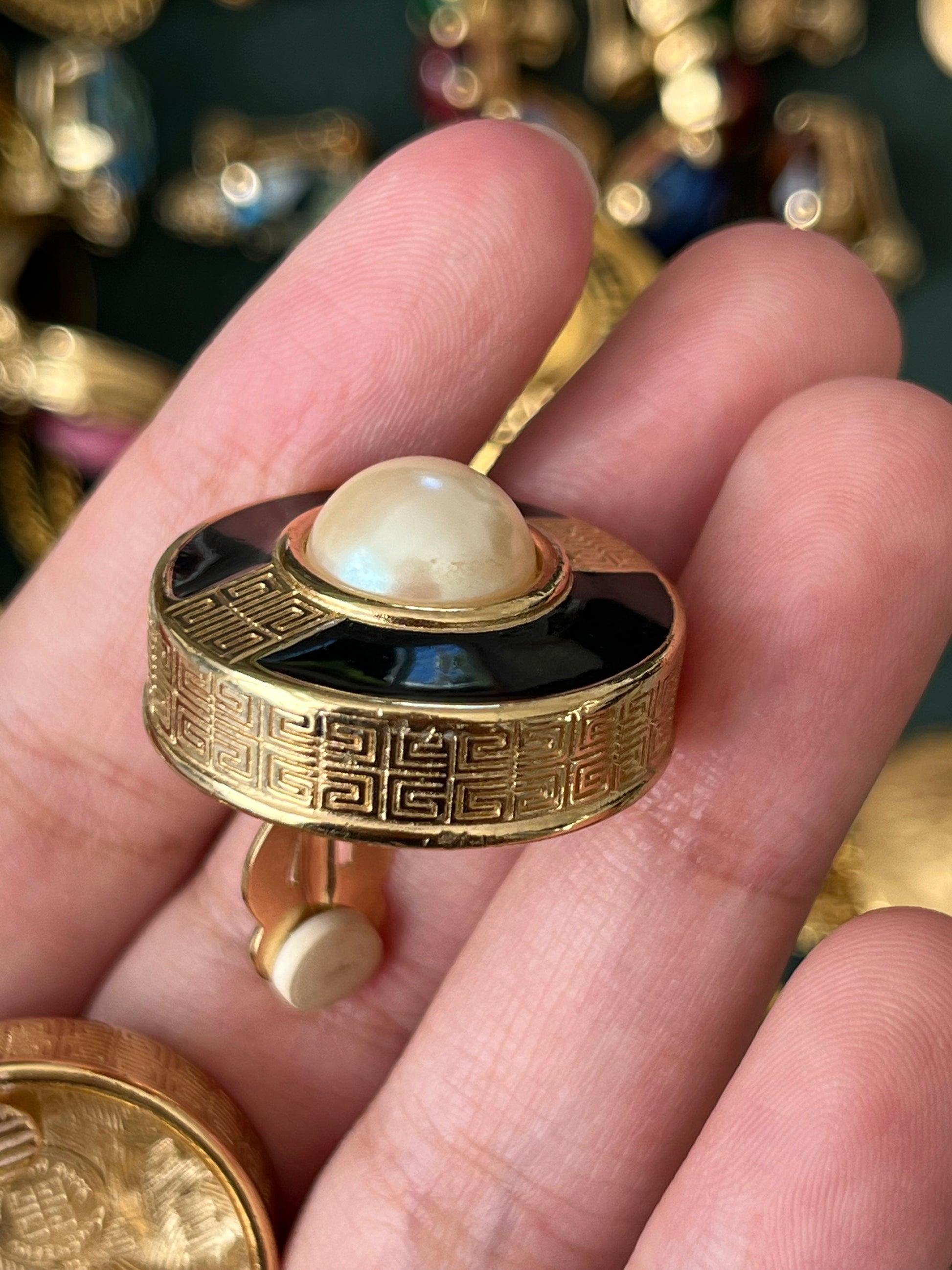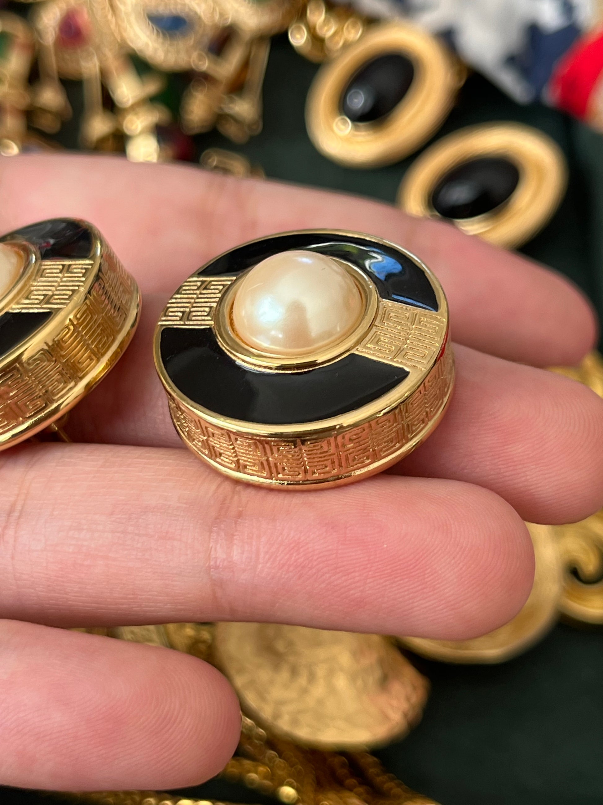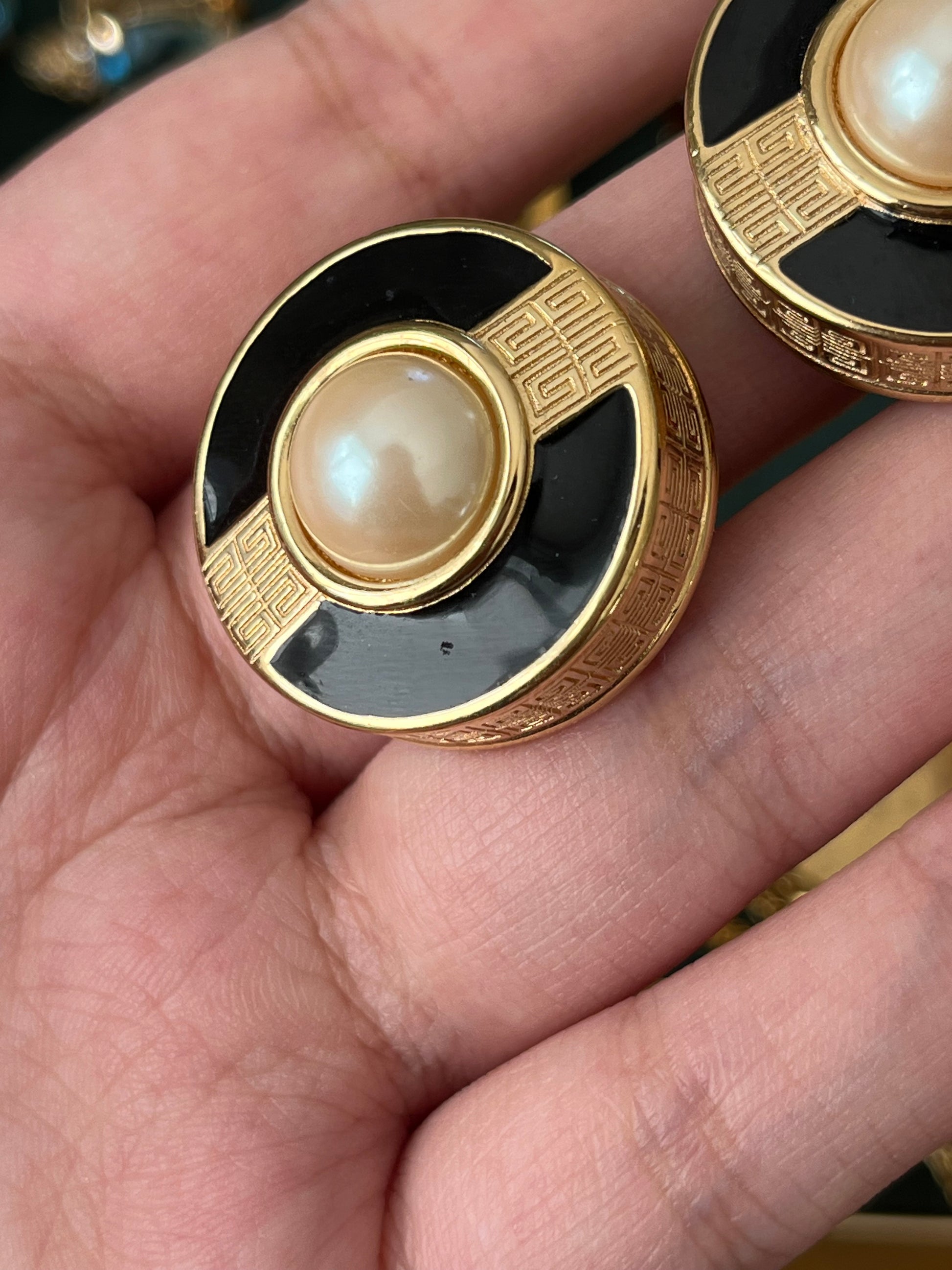 Vintage Givenchy Classic "G" Logo Pearl Black Enamel Round Gold-Plated Clip-On Earrings