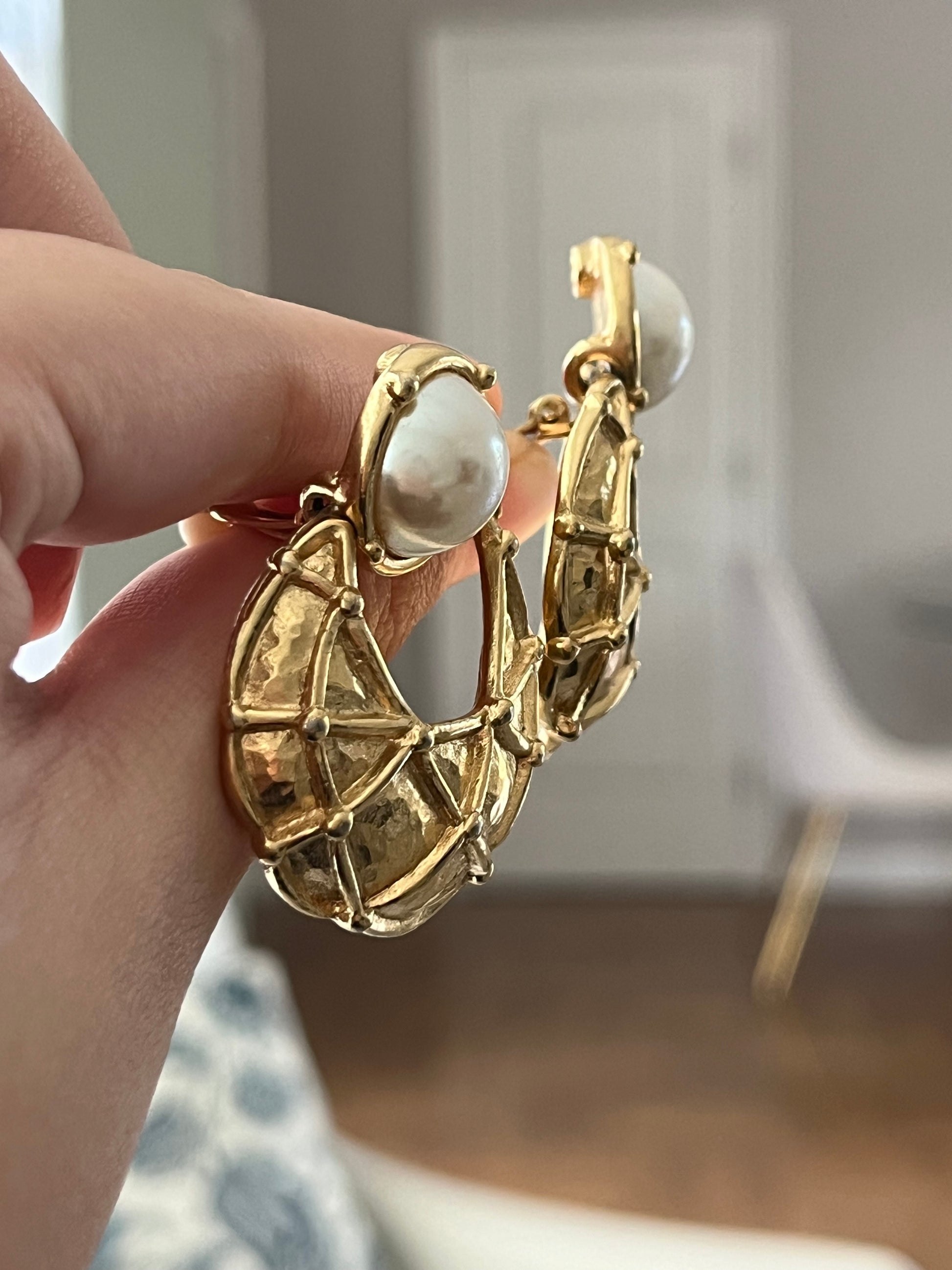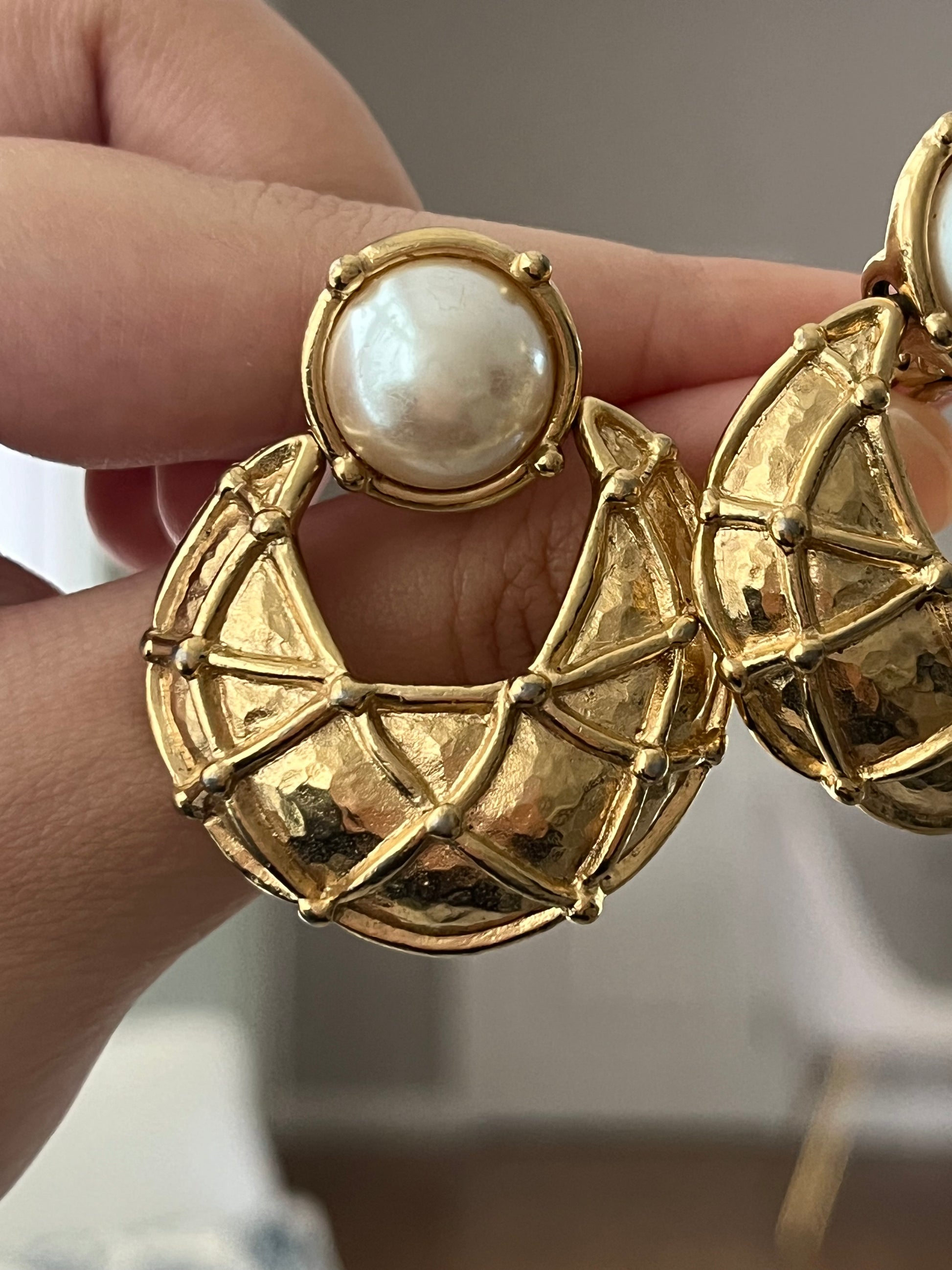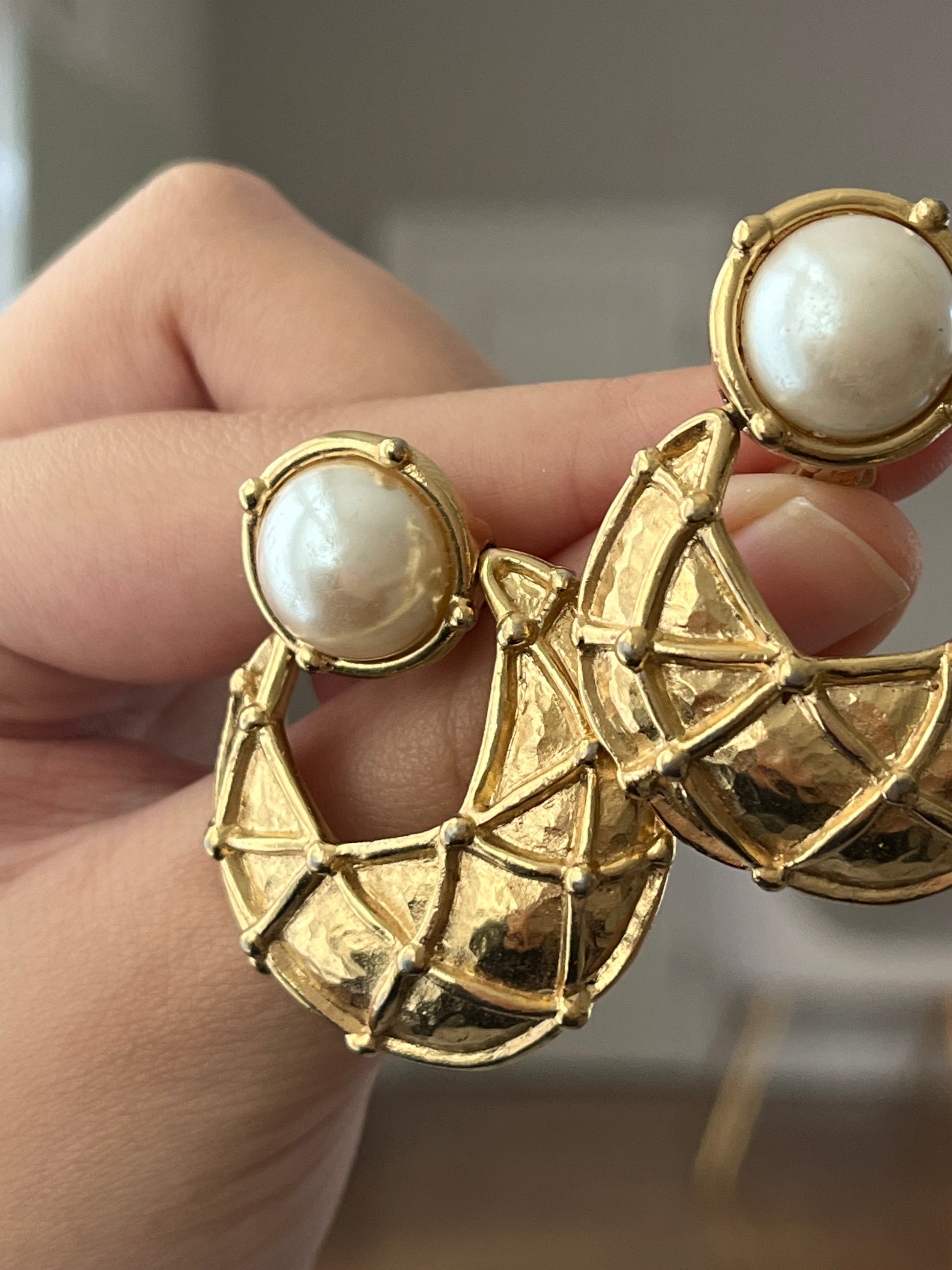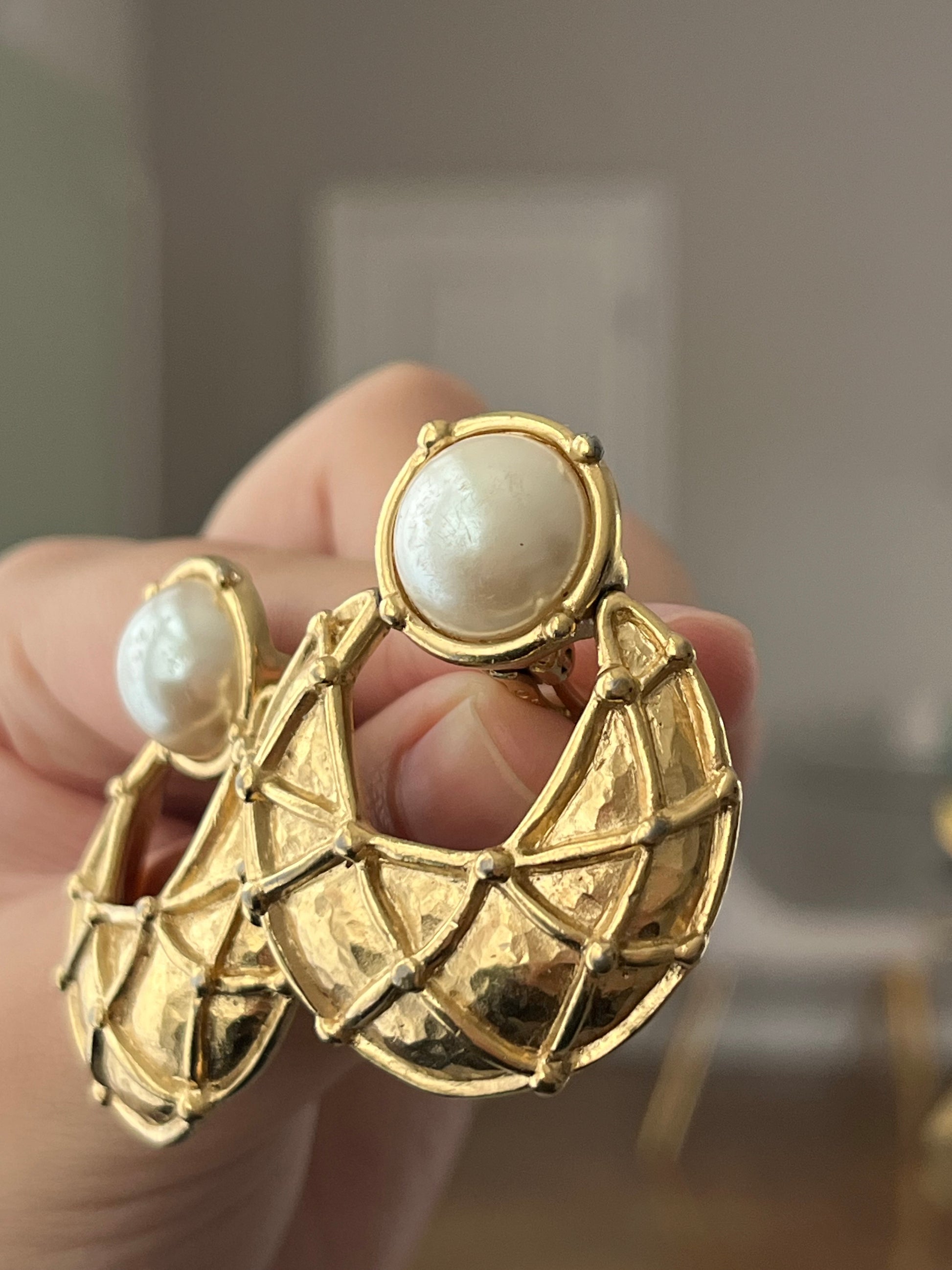 Vintage Givenchy Door Knocker Round Pearl Quilted Drop Gold-Tone Clip-On Earrings