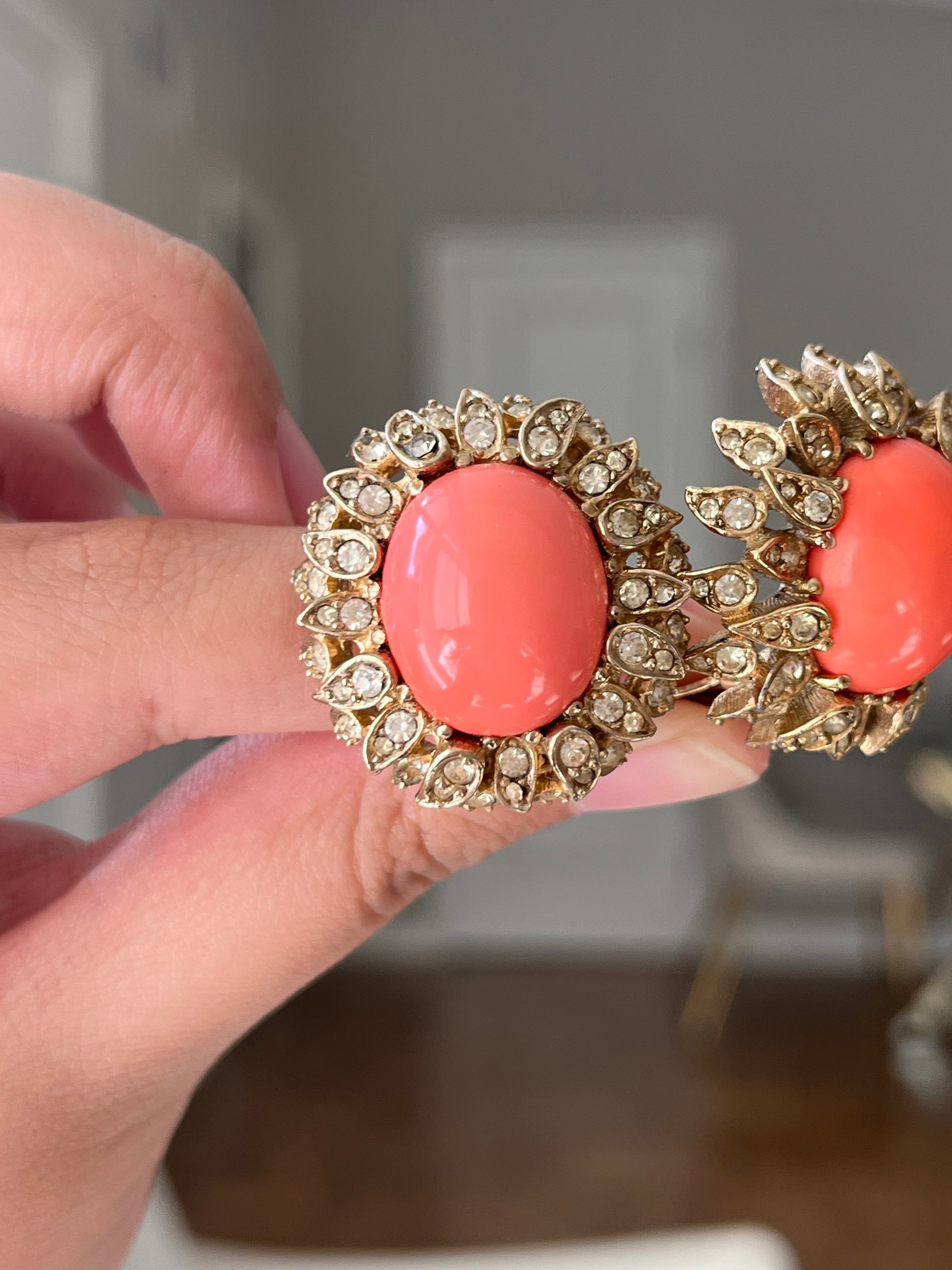 Vintage Ciner Sunflower Oval Coral Pink Poured Glass Cabochon Rhinestone Gold-Tone Clip-On Earrings