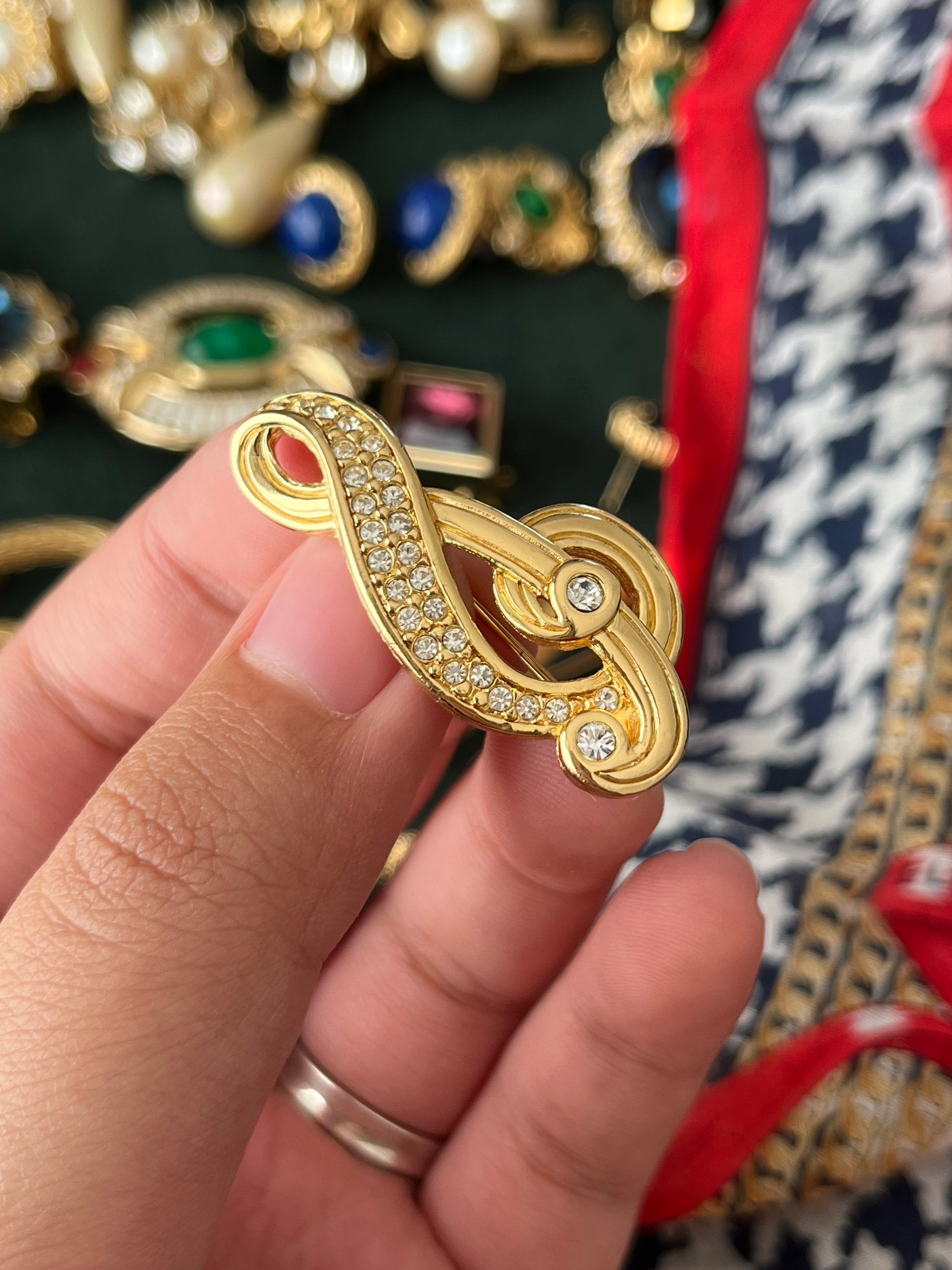 Vintage Christian Dior Treble Clef Music Note Rhinestone Gold-Plated Brooch