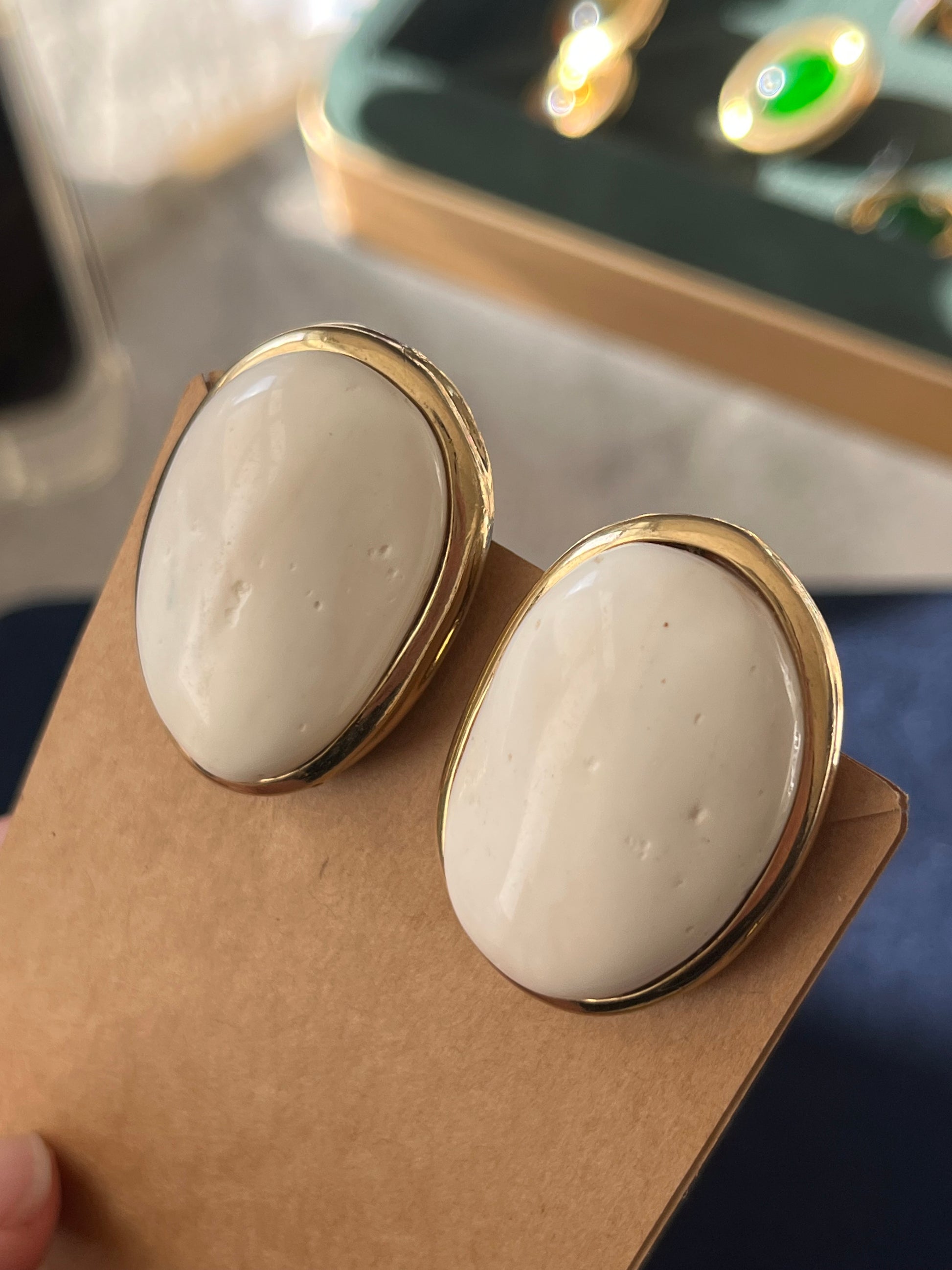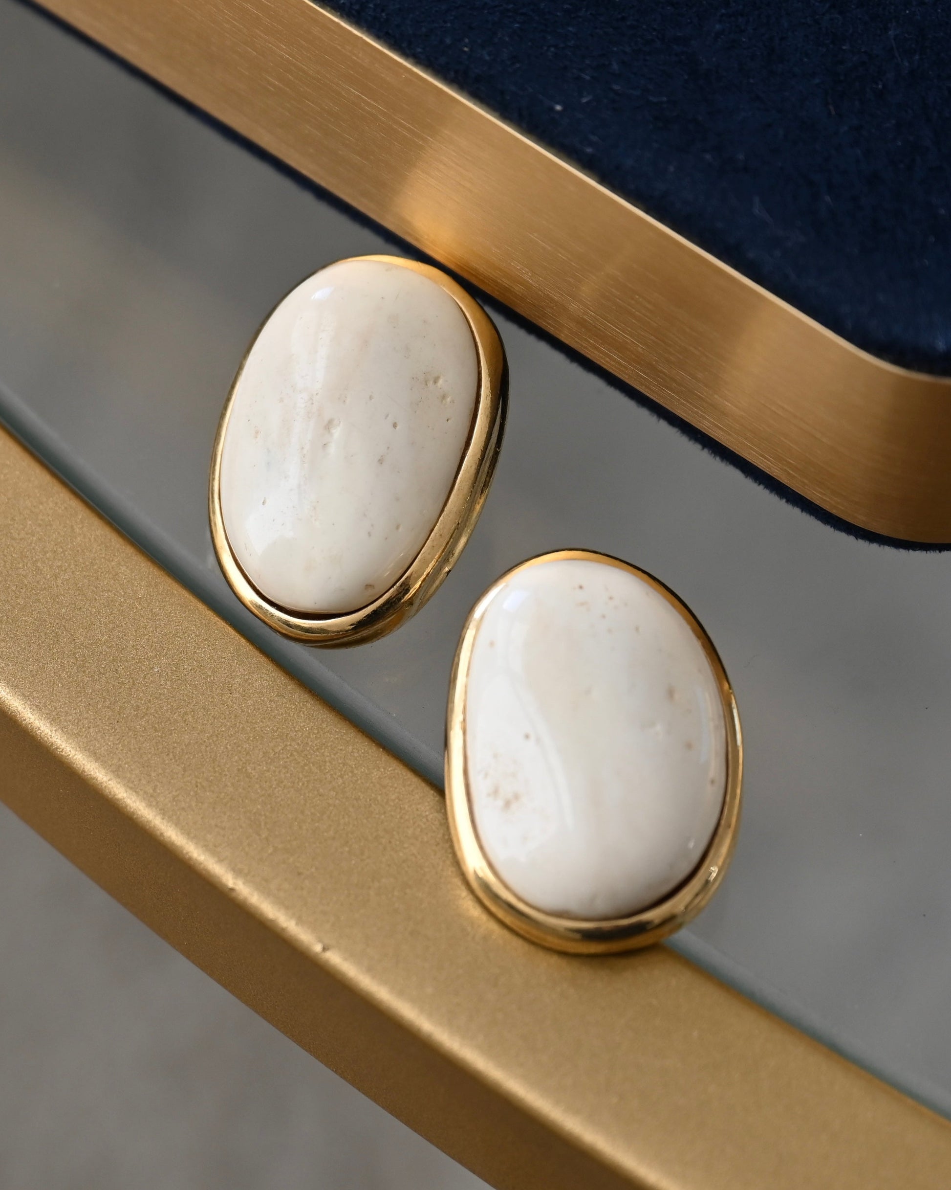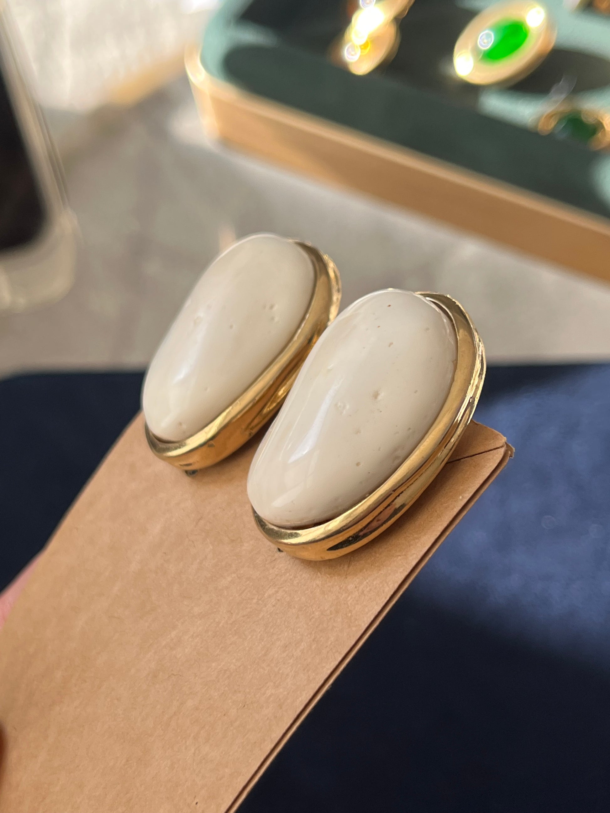 Vintage Givenchy Irregular Cream Faux Marble Shell Resin Cabochon Gold-Tone Clip-On Earrings