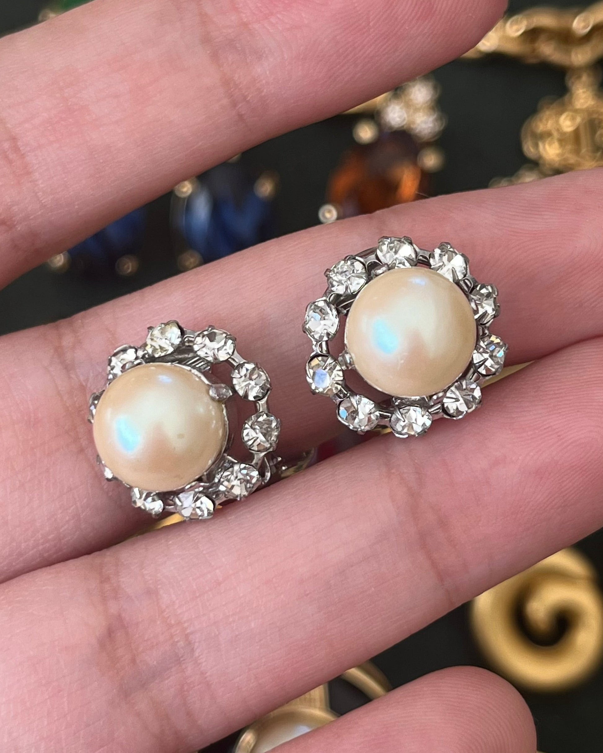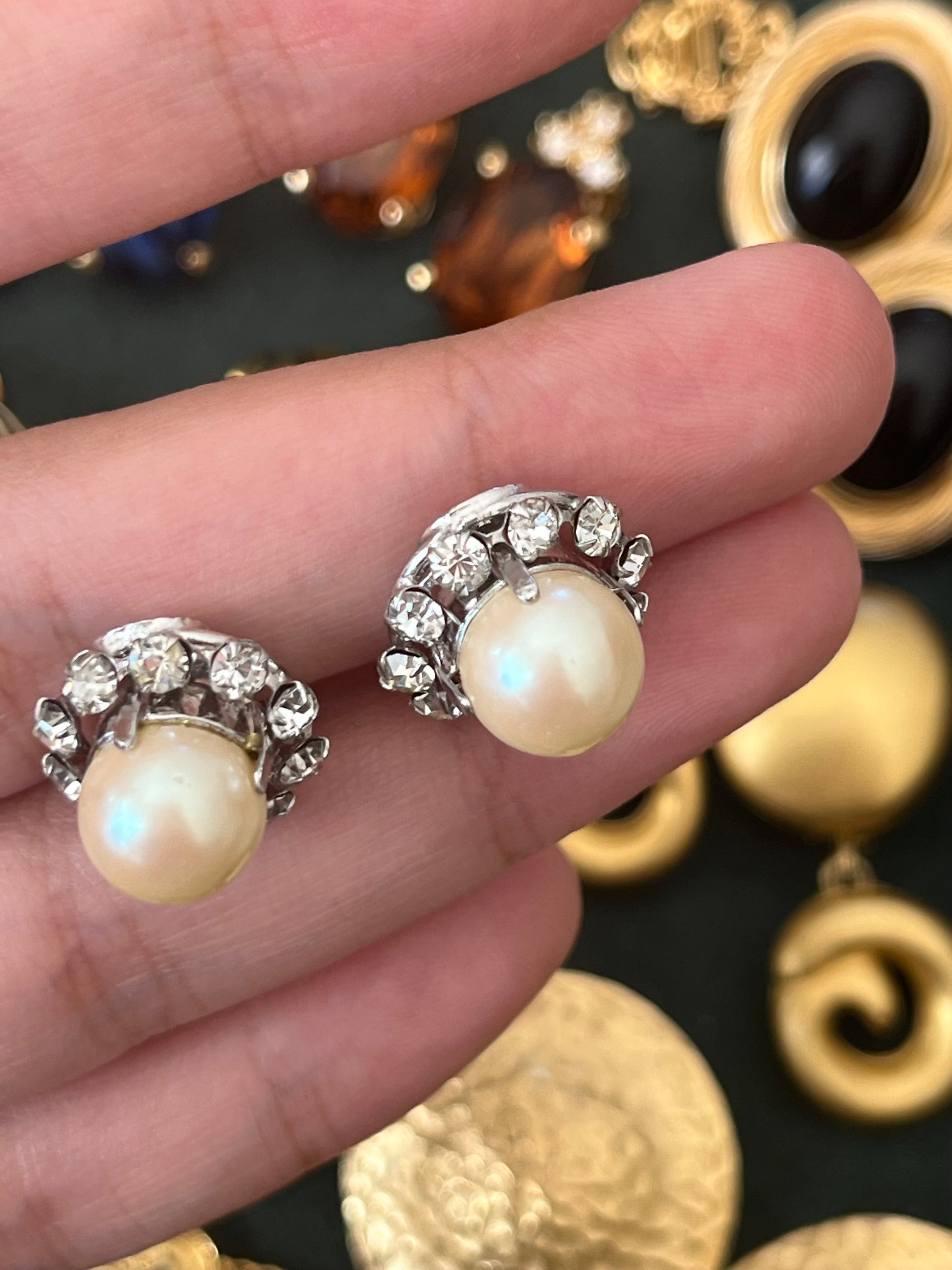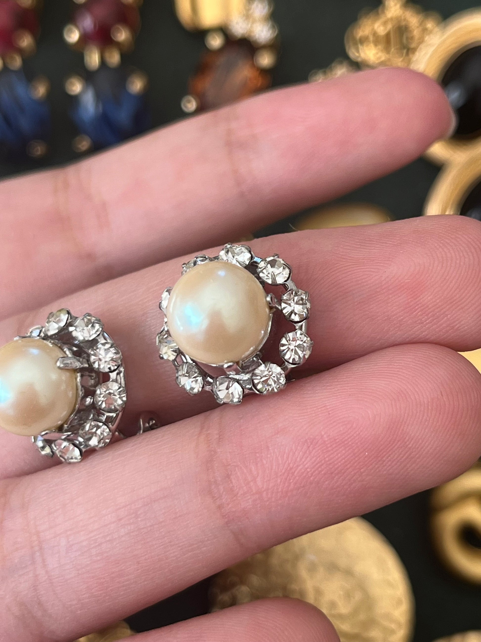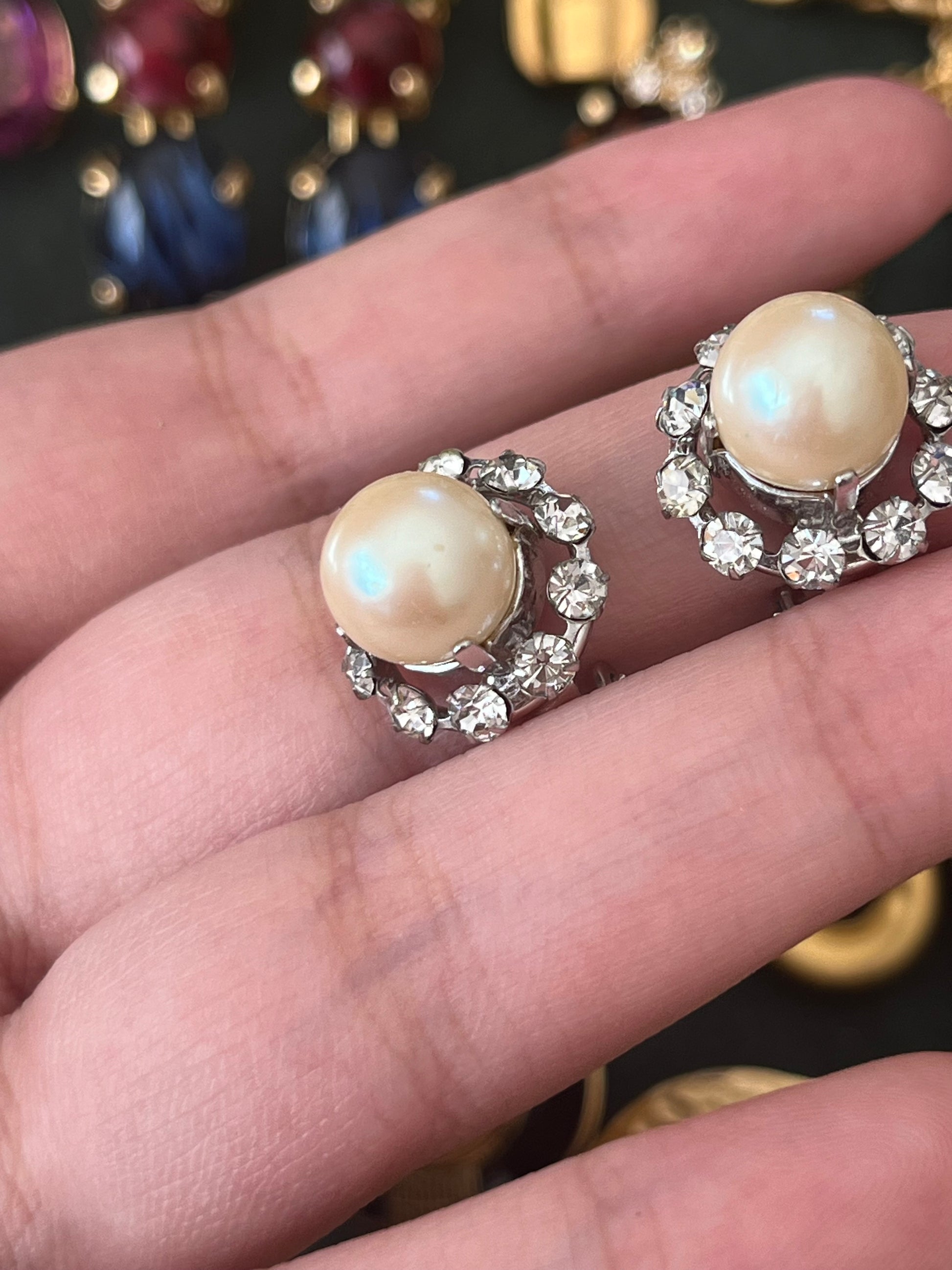 Vintage Christian Dior 1960 Pearl with Rhinestone Edge Mini Round Silver-Tone Clip-On Earrings
