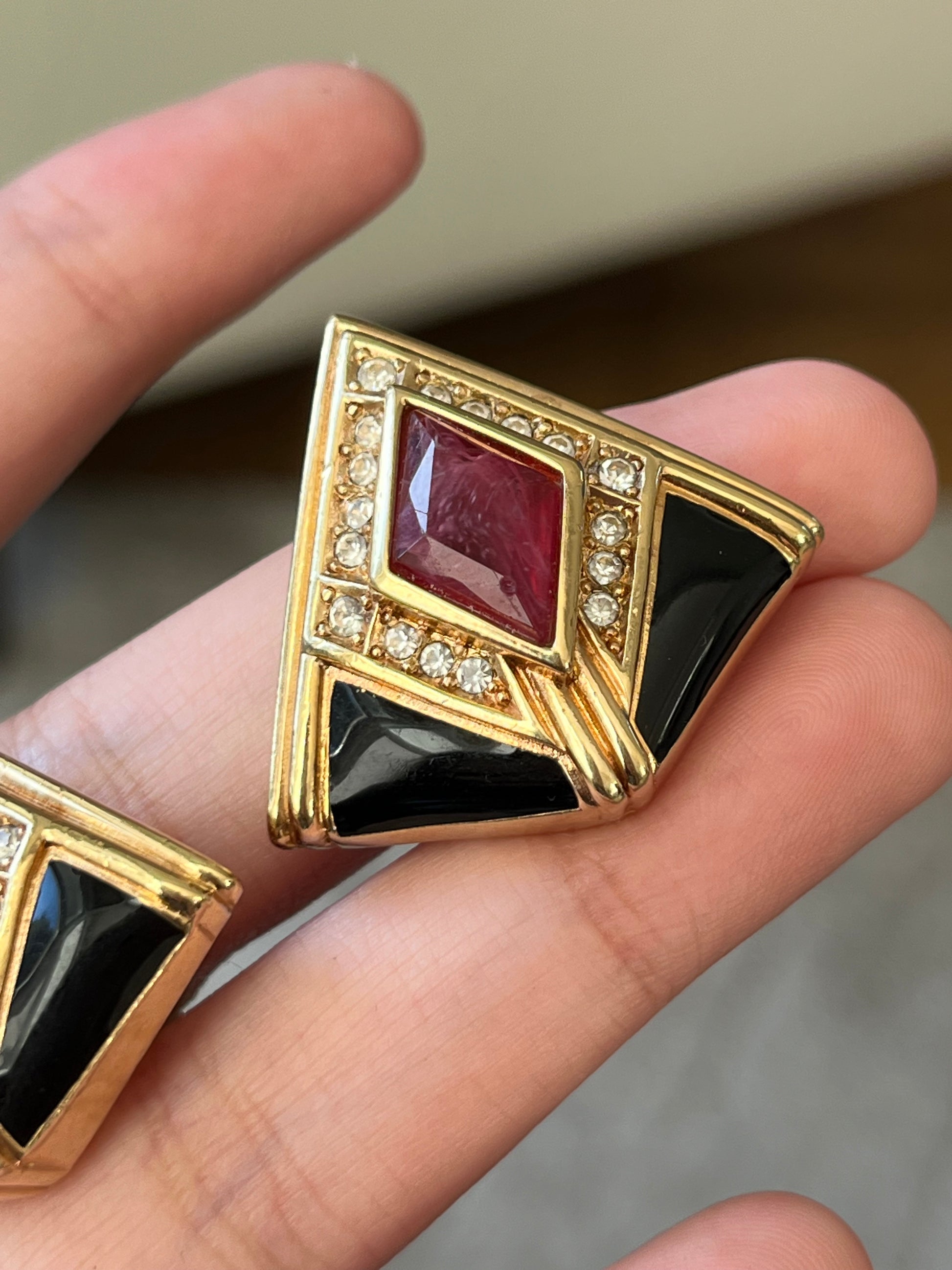 Vintage Christian Dior Red Swirly Glass Cabochon Black Enamel Rhinestone Triangular Gold-Plated Clip-On Earrings