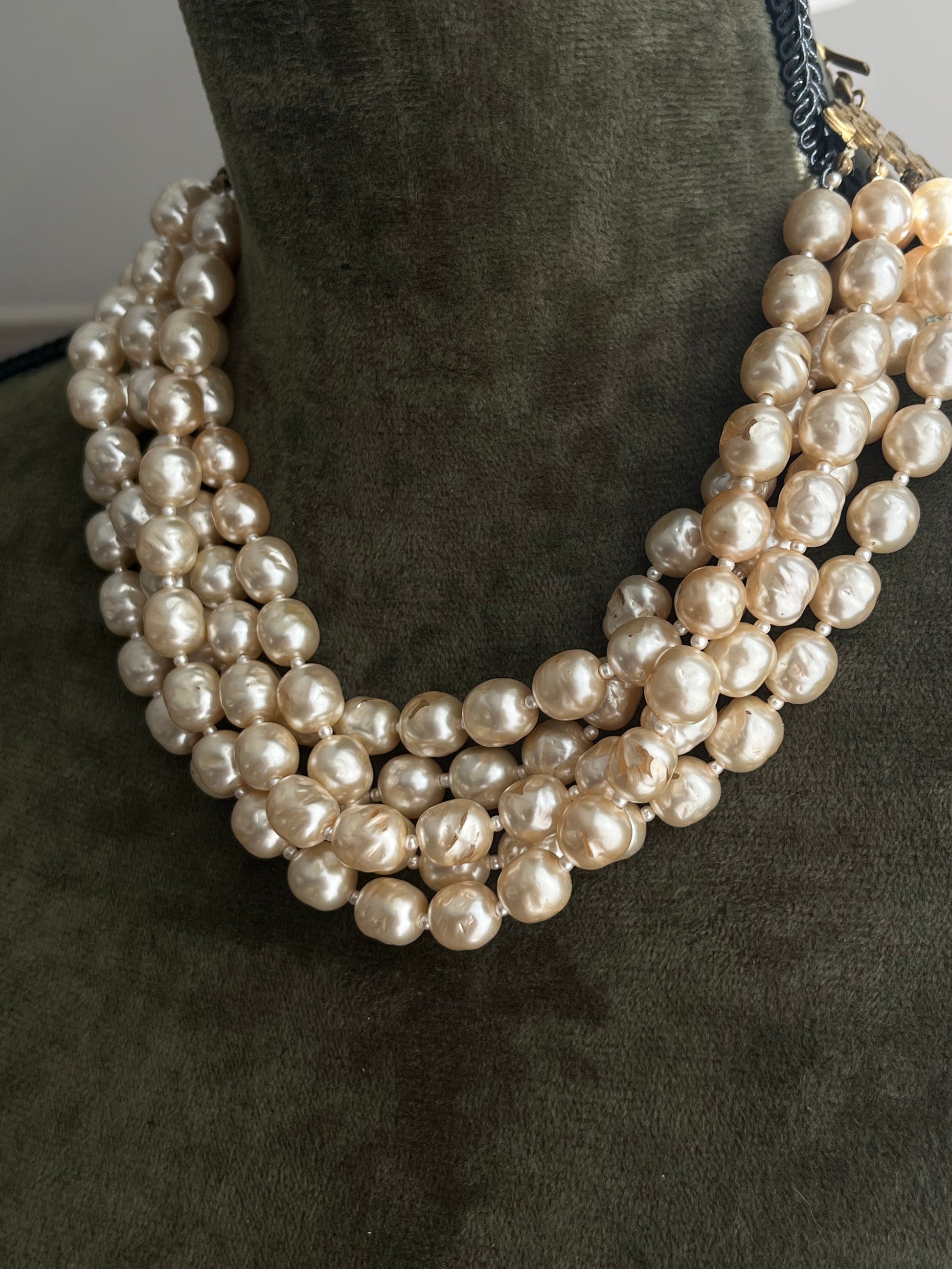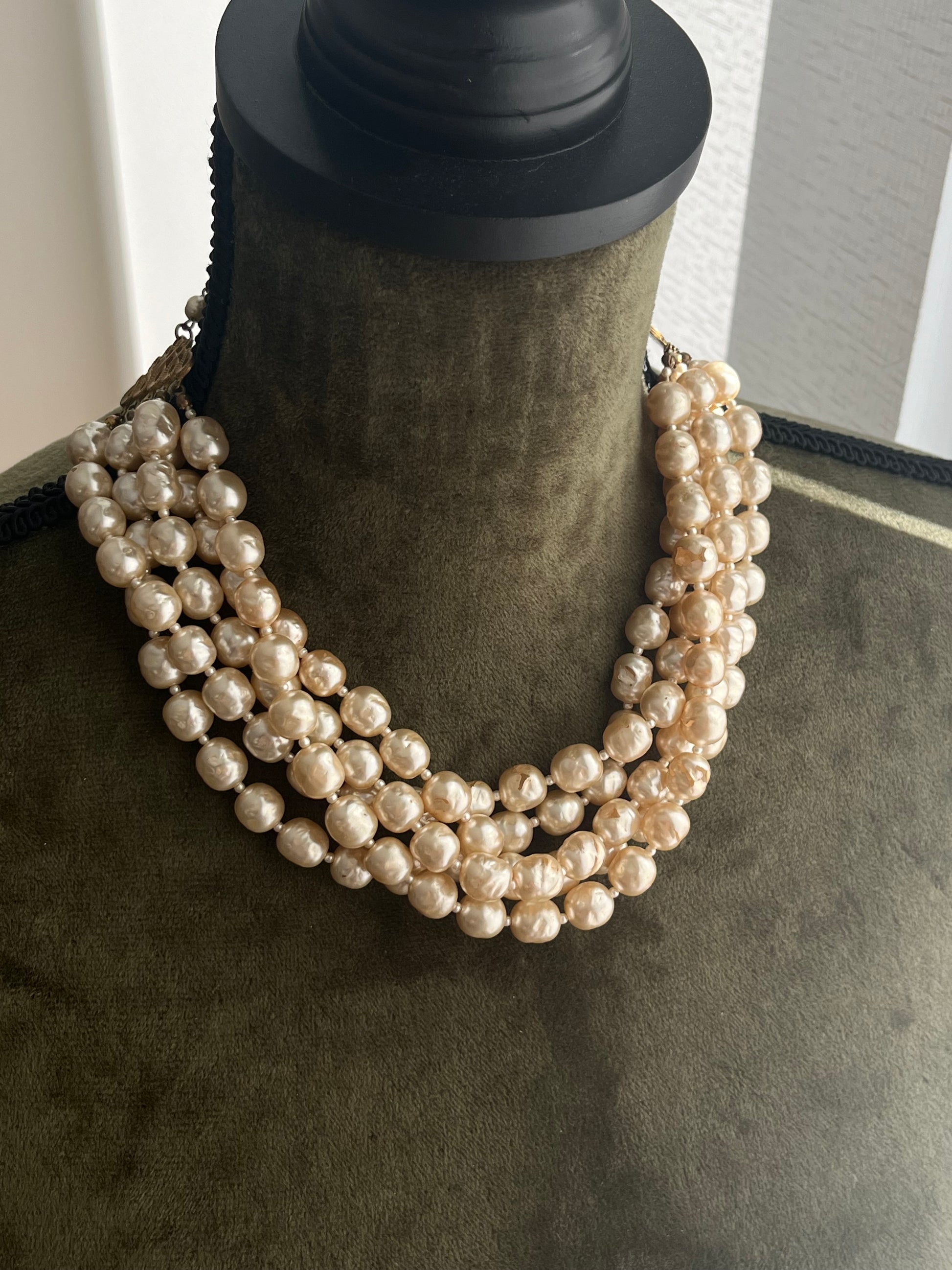 Vintage Miriam Haskell Classic "Niki" Baroque Glass Pearl Five-Stranded Beaded Layered Statement Necklace