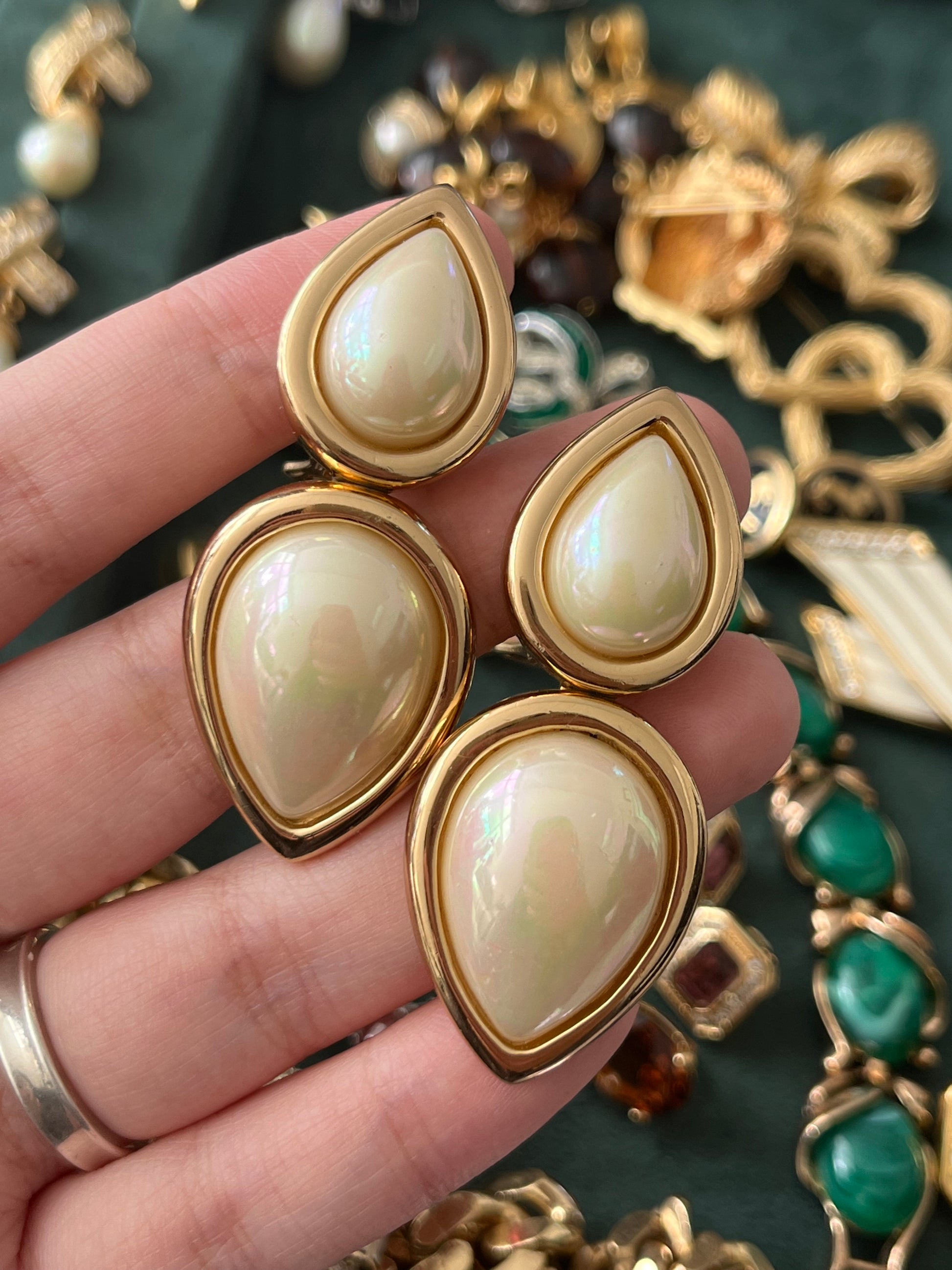 Vintage Christian Dior Teardrop Pearl Cabochon Dangle Drop Gold-Tone Clip-On Earrings