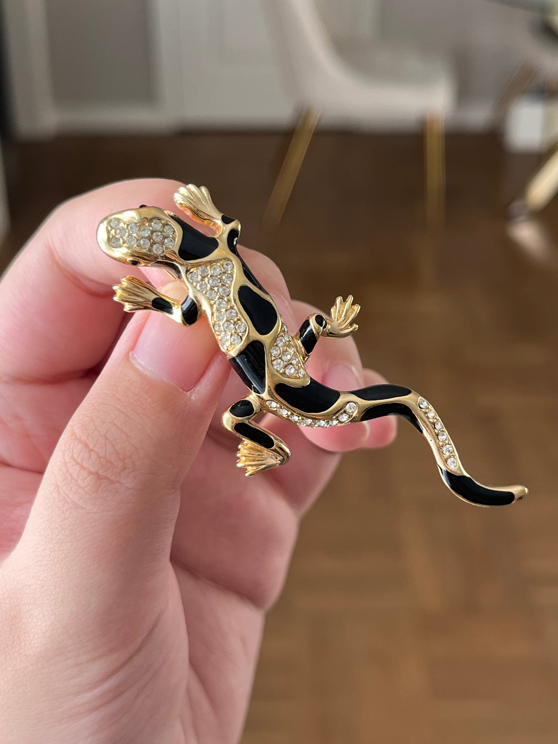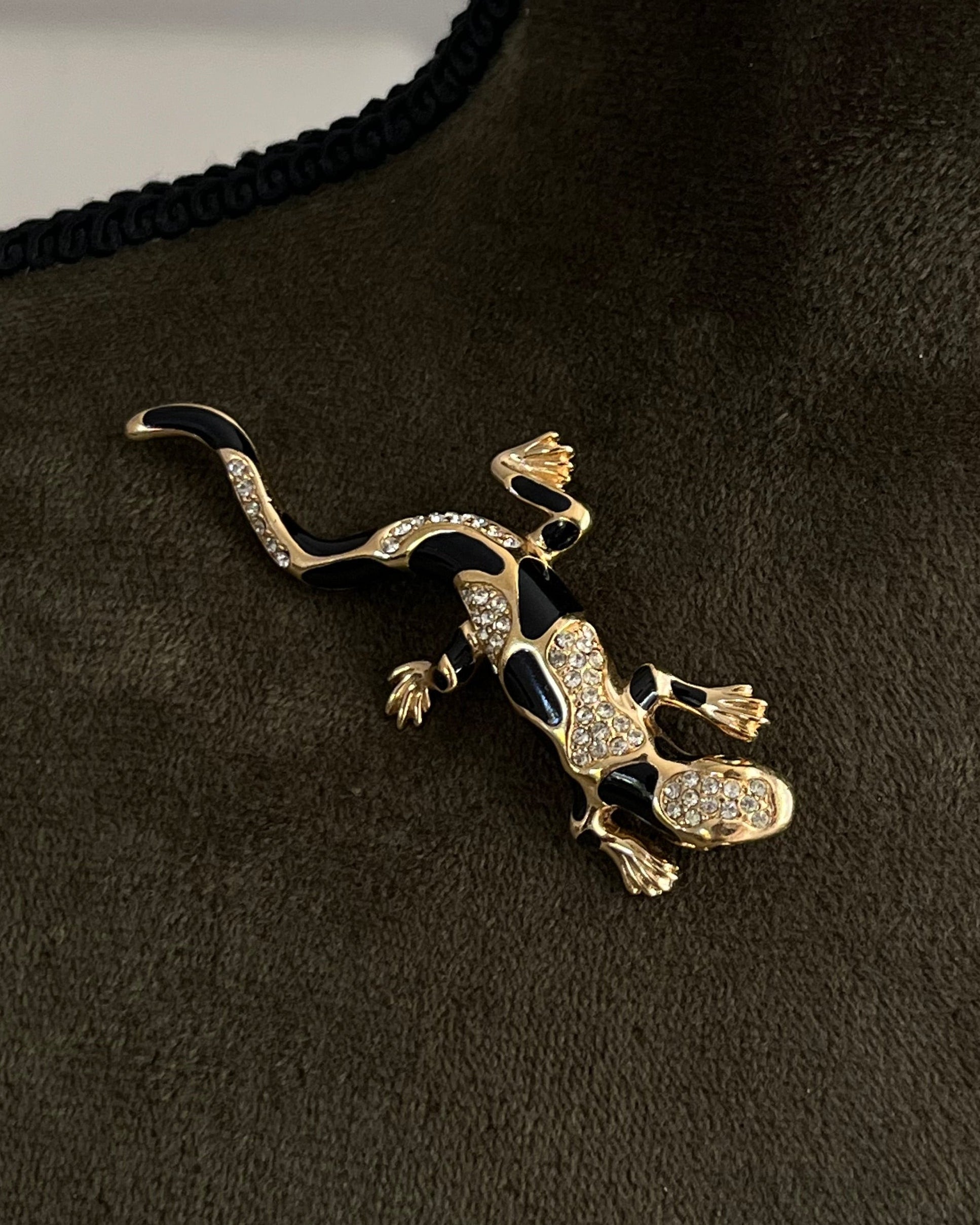 Vintage Christian Dior "Zoo" Collection Lizard Black Enamel Rhinestone Gold-Tone Brooch