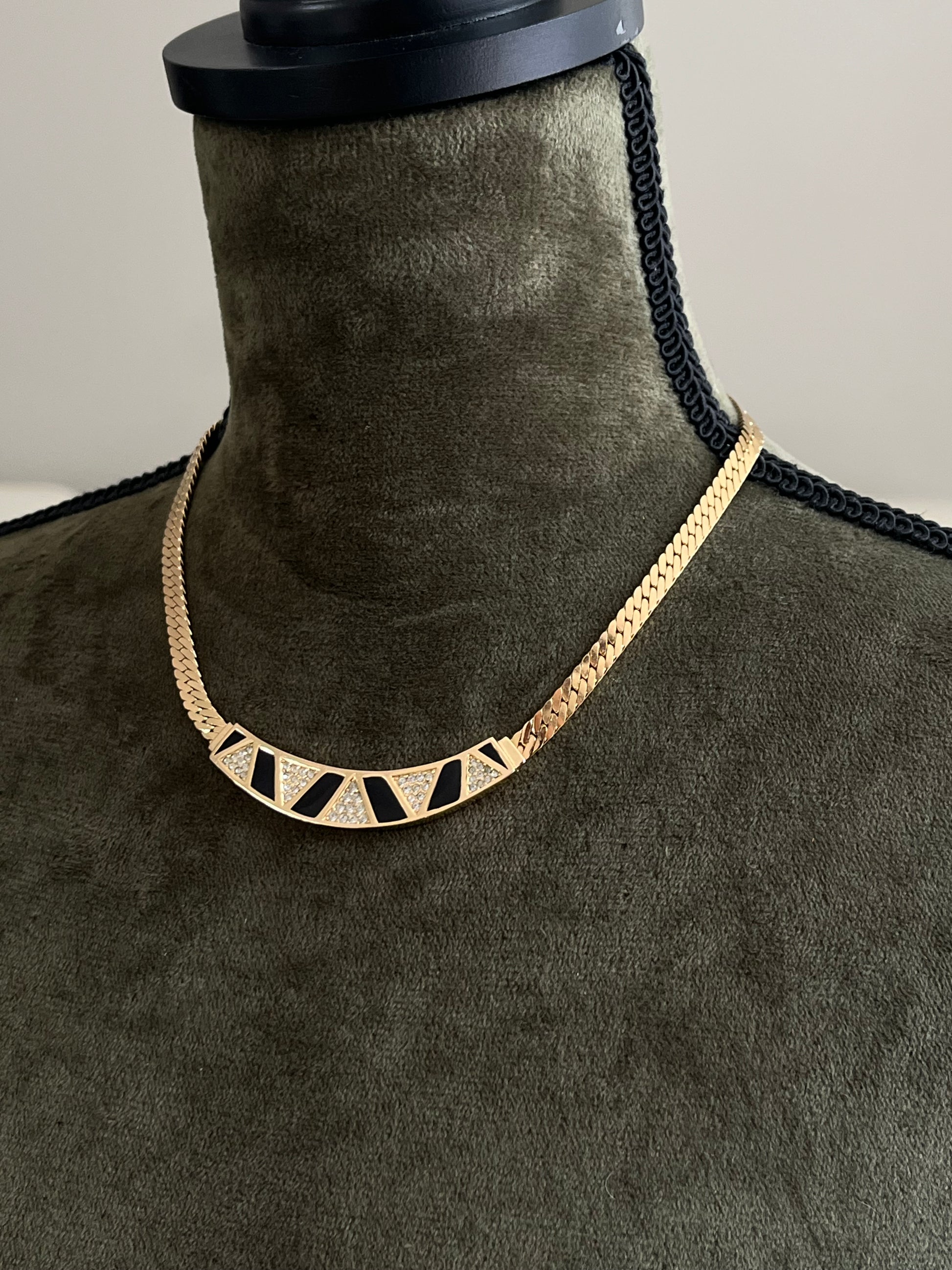 A refined vintage Christian Dior necklace, made in Germany and signed “Chr. Dior © GERMANY” on the clasp, accompanied by a CD tag. The gently curved centerpiece features glossy black enamel segments framed within geometric gold-tone borders, creating a rhythmic architectural pattern across the neckline. Subtle rhinestone accents provide restrained brilliance, while the structured collar-like form reflects Dior’s bold modernist design language of the period.