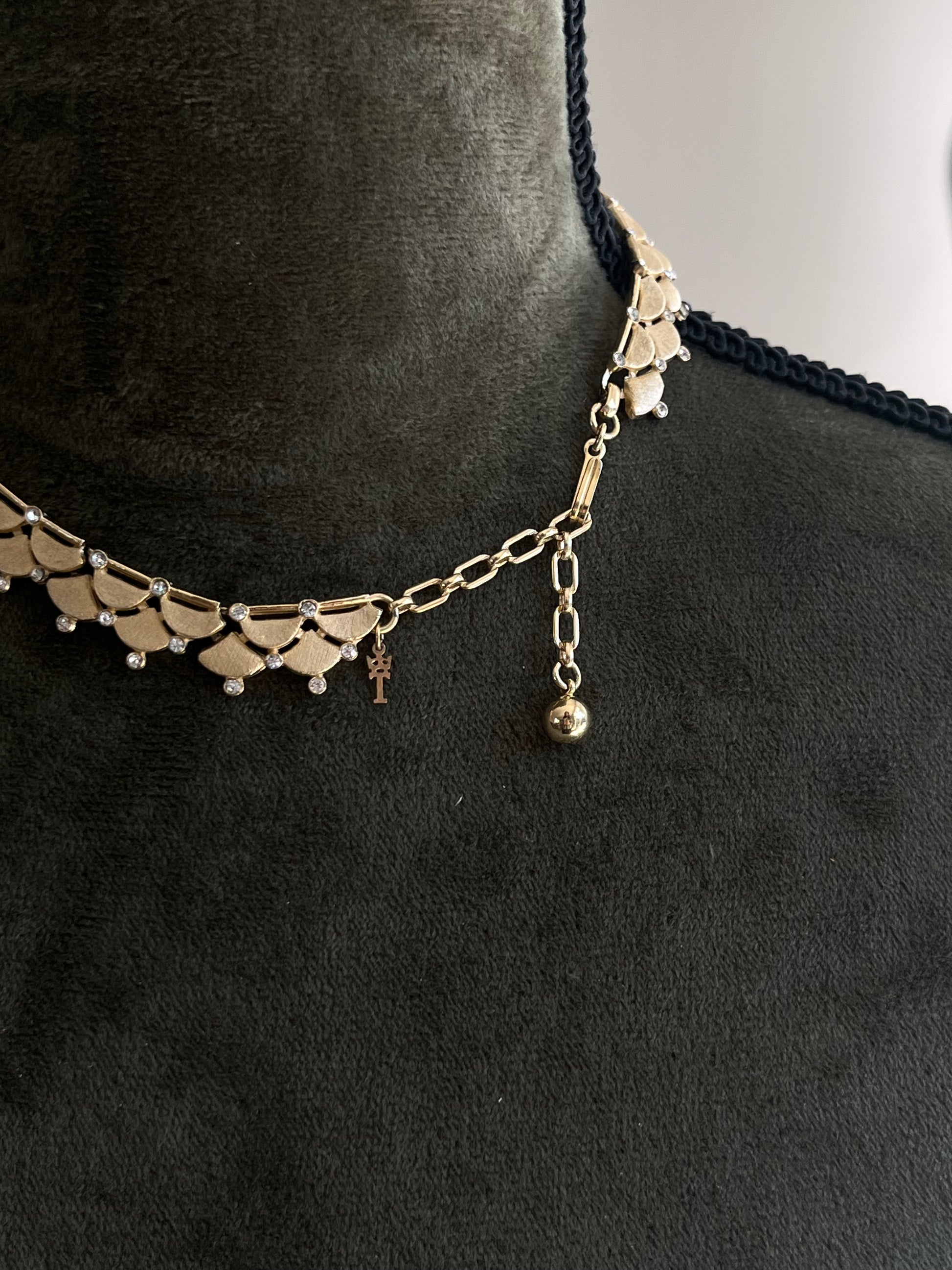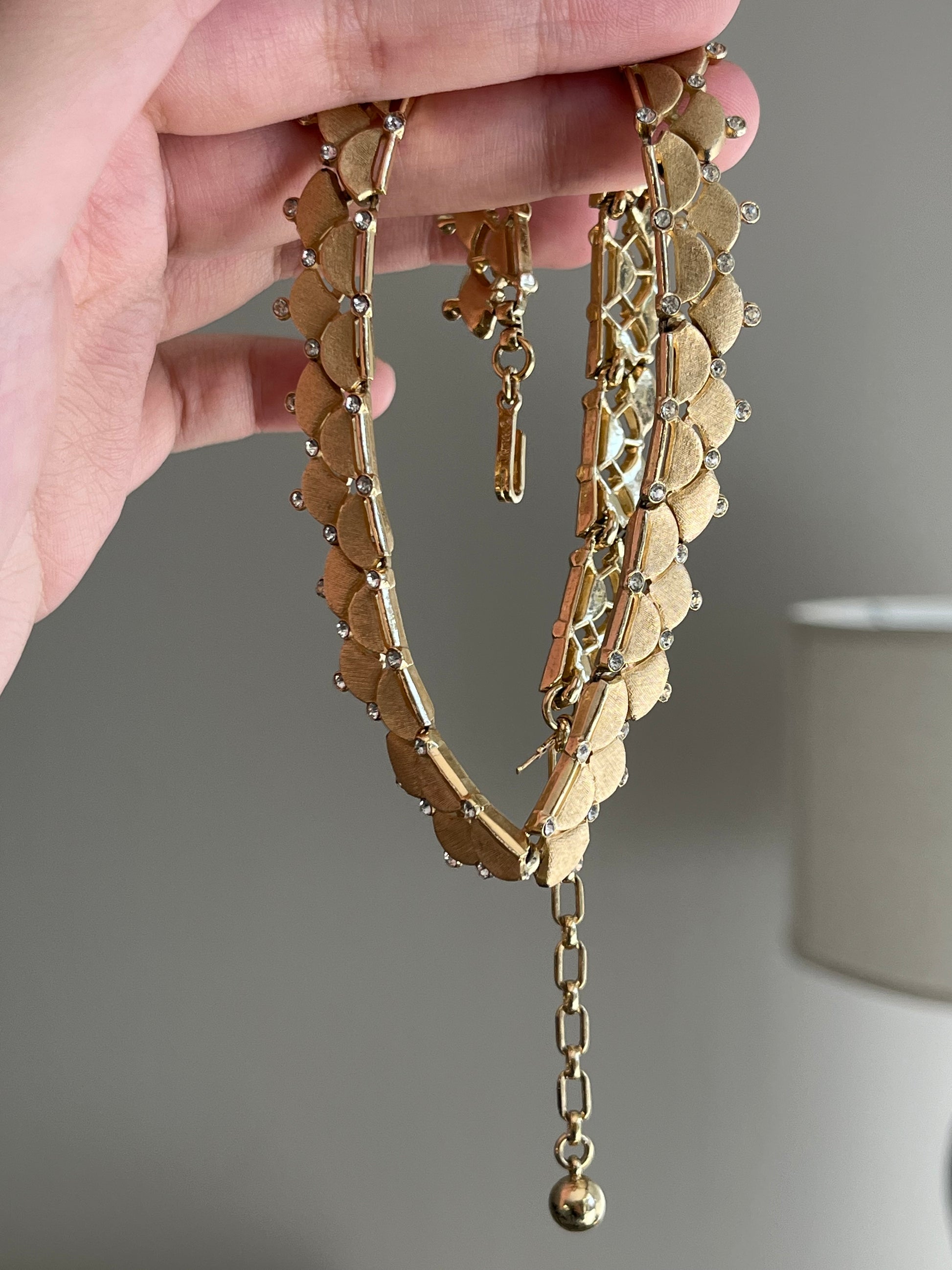 Vintage Crown Trifari "Dagon Scale" Layered Pedal Rhinestone Gold-Tone Choker Necklace