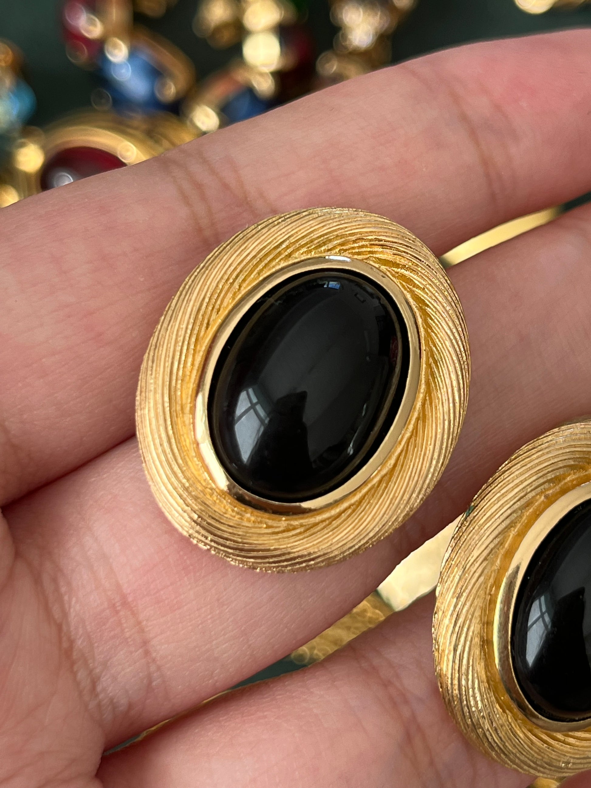 Vintage Christian Dior Oval Black Poured Glass Cabochon Brushed Gold Edge 14k Gold Post Pierced Earrings
